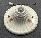PORCELIER Porcelain Ceiling Light Fixture: Art Deco & MCM, EXCELLENT, Rewired This single-bulb, flush mount ceiling light was manufactured by Porcelier sometime between the late 1920's and the early 1950's, the lifetime of the company, and it is appropriate for both art deco and mid-century modern design. The fixture has a cream colored background with floral displays of garden flowers in pink, violet, blue, green and brown. The porcelain is in good condition but has minor stains near one mounting hole and a tiny chip at the other mounting hole, but both will be difficult to see once installed on the ceiling. We have carefully cleaned the fixture including removing all of the ceiling paint and dirt from the sides and back. We added a new pull chain socket and new wiring. We added a new antique brass pull chain and left it long (18") but it is easy to trim and we would be glad to trim it if the buyer specifies the length. The sale includes the mounting hardware (antique brass mounting nuts, threaded screws, & crossbar). If the buyer would prefer a chain and mounting nuts in nickel or bright brass, just say so and we will substitute. The fixture is 6-3/4" in diameter and is 3" high. It uses a standard base bulb (not included). All of our lights have been tested, are guaranteed to be as described, and we will accept their return if the buyer is dissatisfied. Just notify us within 30 days of receiving them. Shipping is buyer's choice of USPS Ground Advantage , UPS Ground, FedEx Ground, or USPS Priority Mail. We have other antique lighting for sale including other Porcelier ceiling fixtures, so please check out lighting store !
