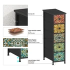 Retro Dresser with Fabric Drawers Boho Mandala Flower Chest of Drawers Narrow Storage Tower Unit for Small Spaces Gaps Bedroom Beautiful Nightstand Living Room End Table ORIGIN Design Mandala Fabric Drawers Dresser The retro flower pattern on each drawer makes it a stand-out piece of furniture that is sure to catch the eye of anyone who enters the room. It also adds a touch of charm and elegance to your room SPACE-SAVING Design Maximize your storage space with our narrow cabinet featuring a compact design that fits seamlessly into tight spaces, perfect for small rooms, closets, or corners,slim drawers dresser for laundry room or bed beside nightstand STURDY CONSTRUCTION Crafted from thick iron frame and P2 Partical Engineered Wood Board , our storage cabinet is built to last. Sturdy frame and reliable fabric drawers ensure durability and stability, offering a long-lasting storage solution for your home USER-FRIENDLY DETAIL DESIGN The four metal feet are equipped with height adjustable foot pads to protect your floors and designed for uneven floors.Plus, anti-tip accessory included to prevent accidents.This dresser is perfect for bedrooms, nurseries, closets, entryways,bathroom,and living rooms EASY ASSEMBLY AND MAINTENANCE Simple assembly allows you to enjoy your new storage solution in no time. The fabric dresser is also lightweight and portable, making it easy to move from room to room
