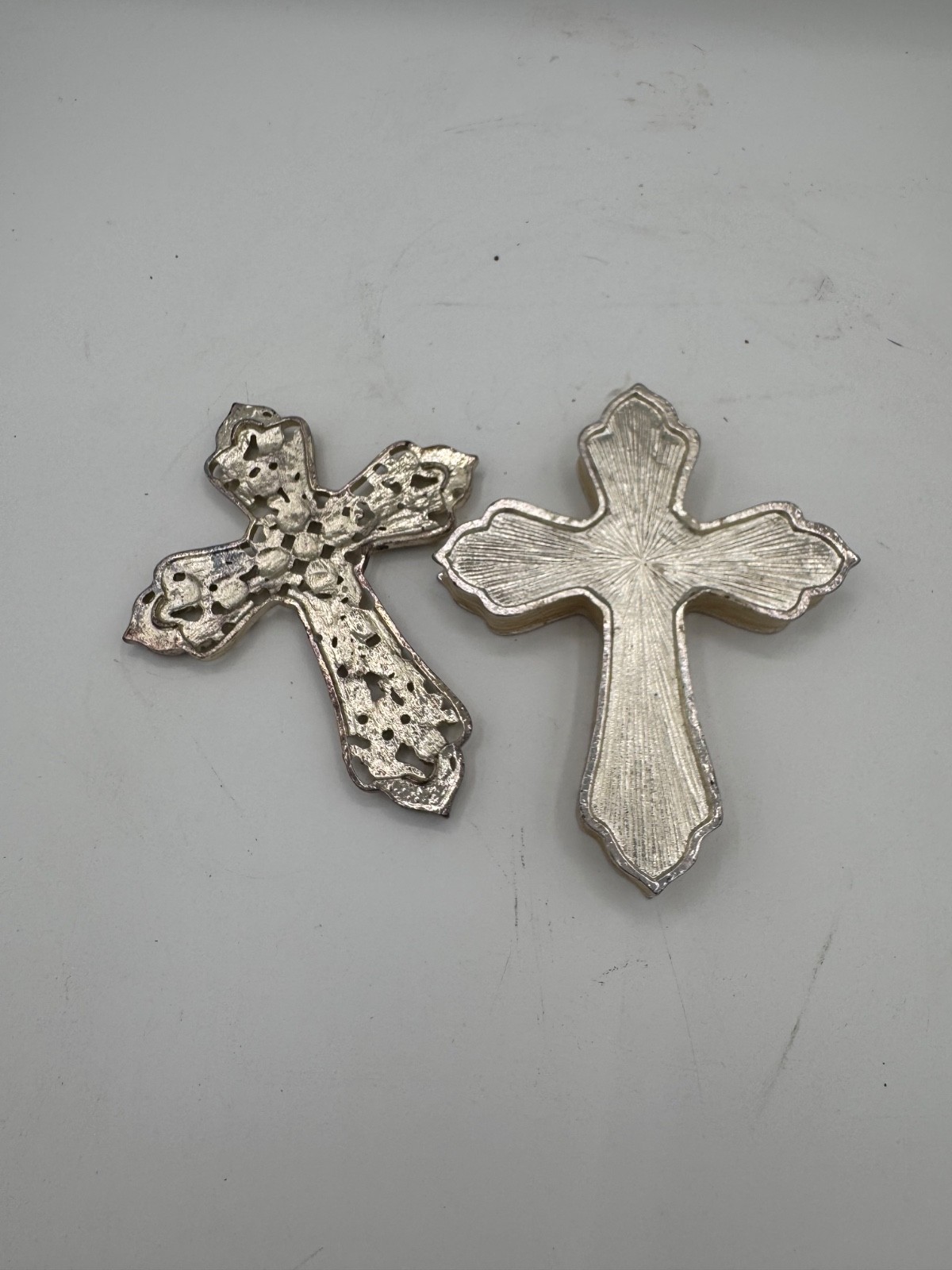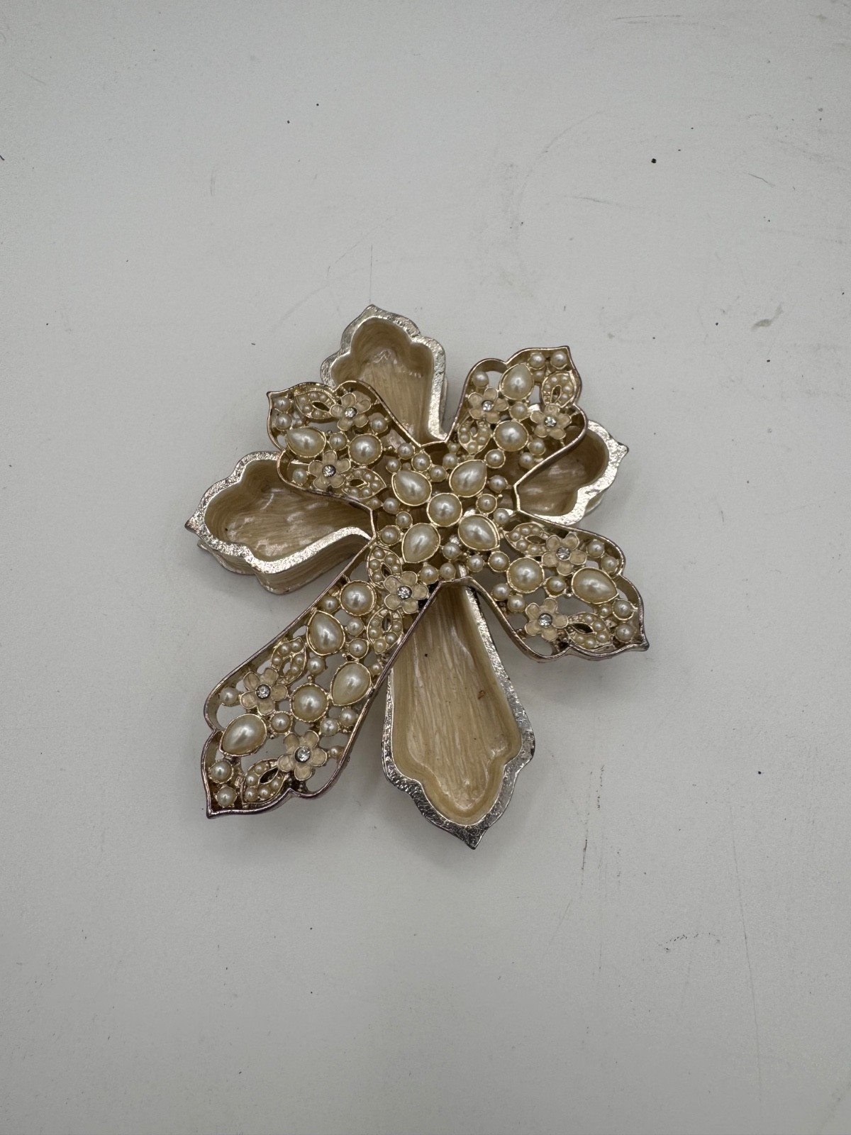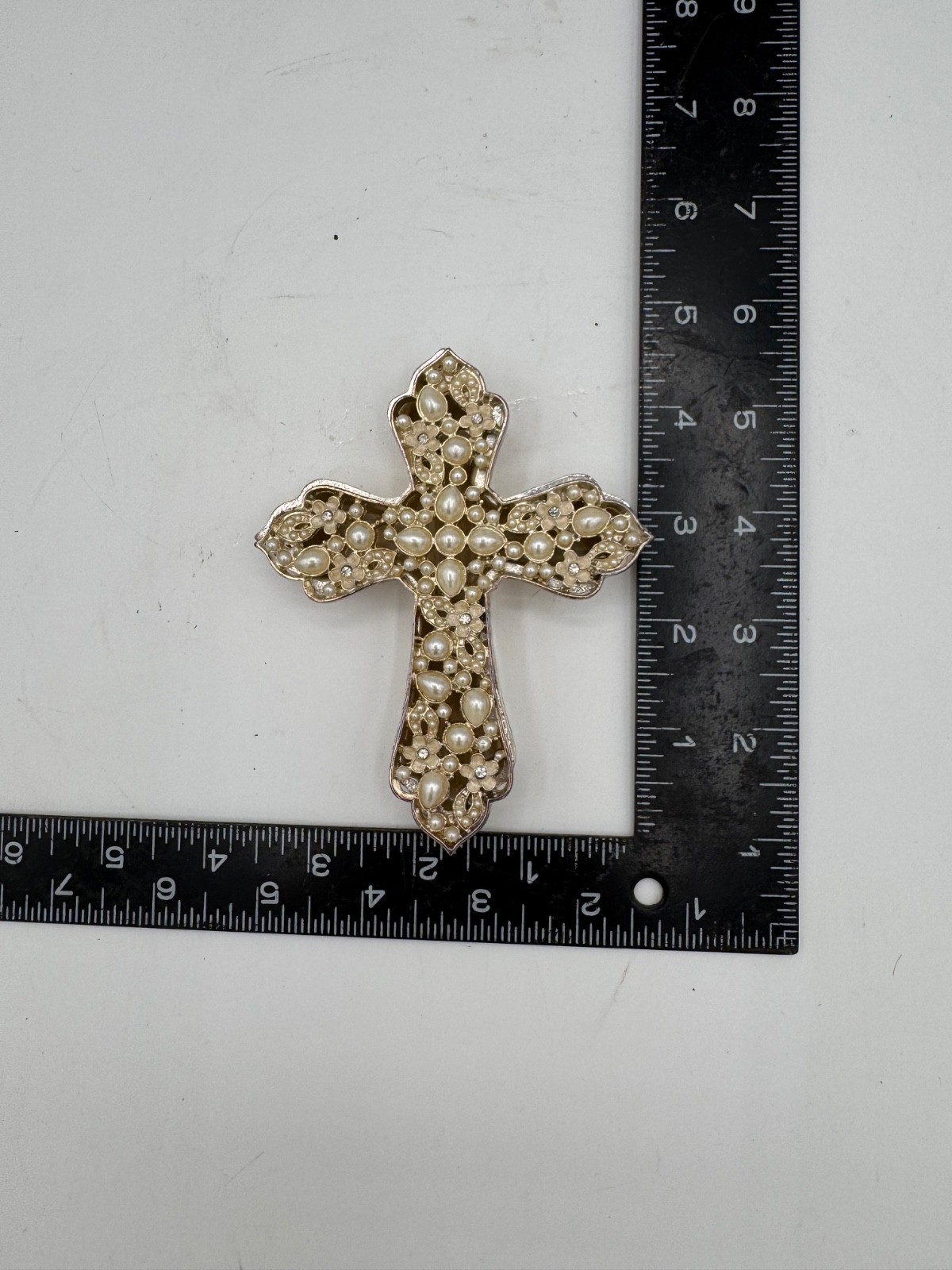 The Rhinestone and Pearl Studded Enameled Cross Trinket Box is a beautifully crafted decorative collectible featuring a cross shape design. Made with enamel material and adorned with rhinestones and pearls, this trinket box exudes elegance and sophistication. The pearls adds a touch of luxury to the overall design, making it a perfect accessory for storing small treasures or jewelry. Perfect for those who appreciate unique and religious-themed decor, this trinket box is a stylish and functional addition to any space. Thanks for shopping!
