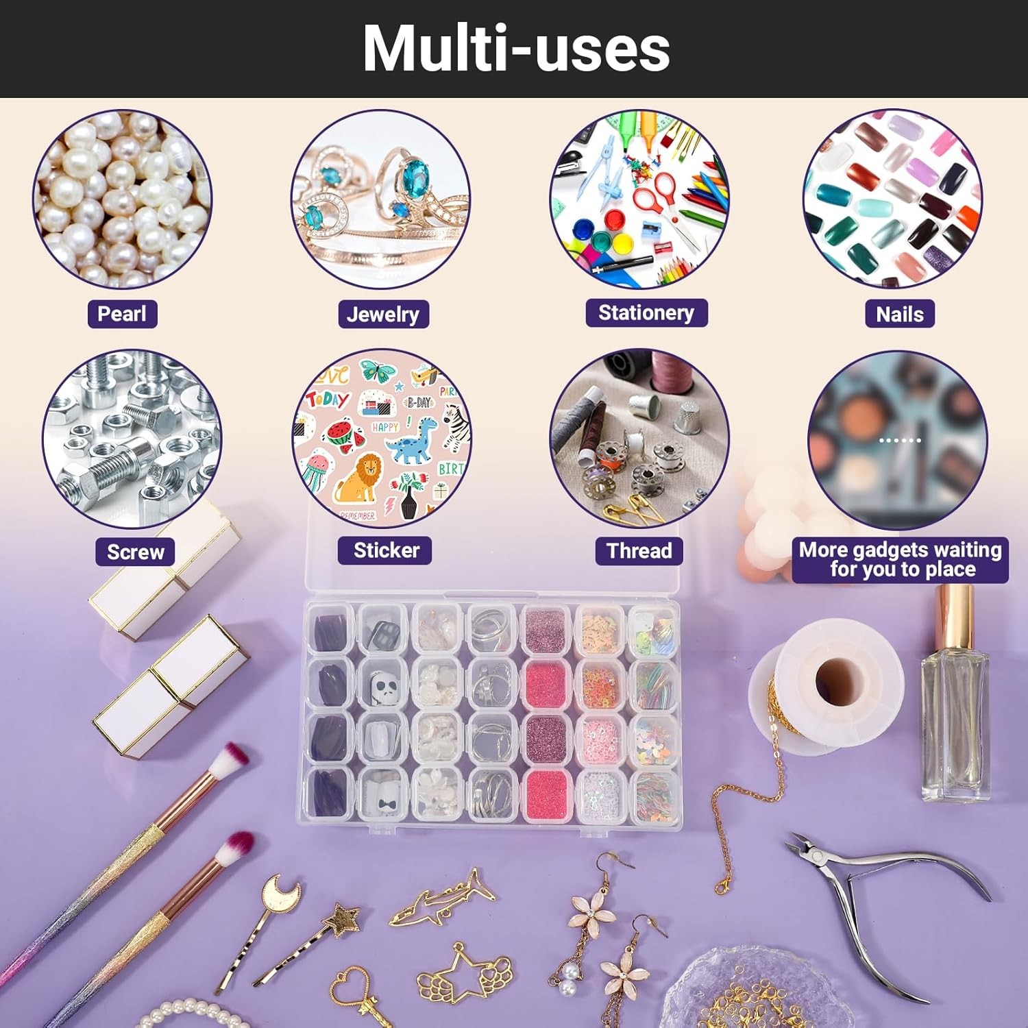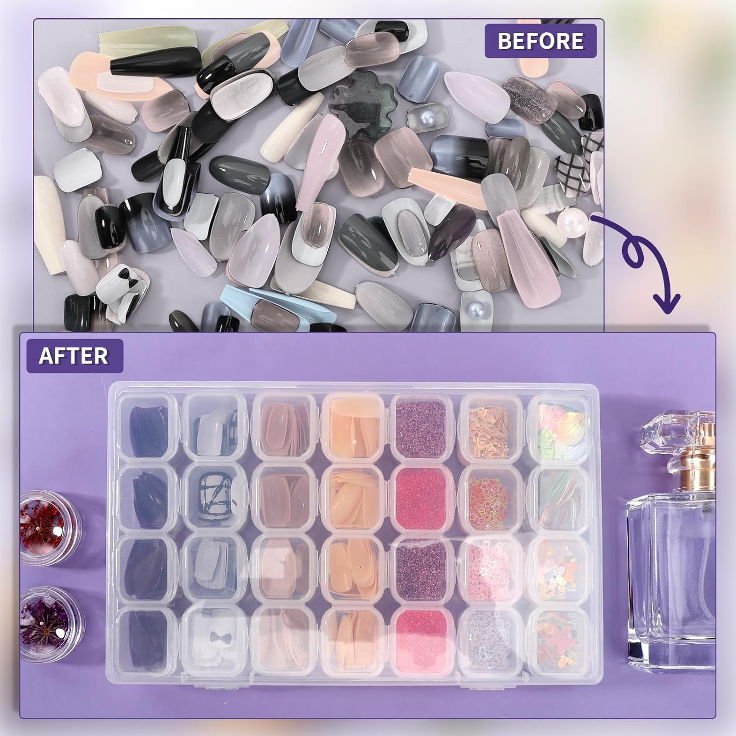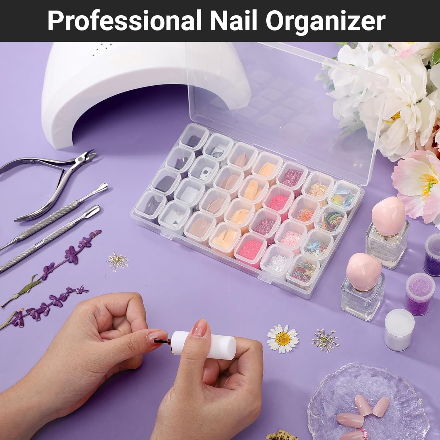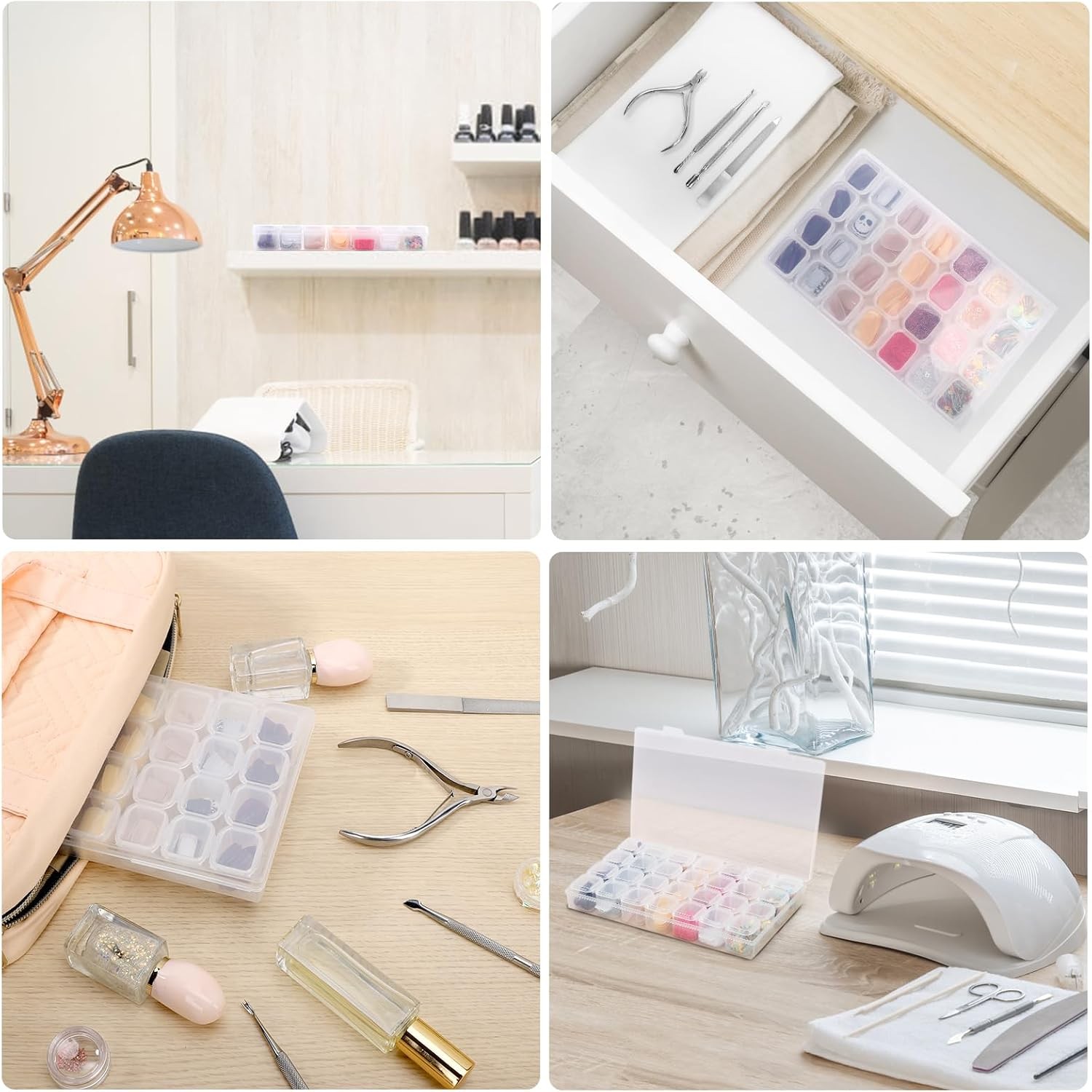 Color Clear Material Polypropylene, Plastic Product Dimensions 6.89"L x 4.09"W x 1.02"H Closure Type Latch About this item 【Compact Dimension】28 grids clear organizer box with separate lids. Outer storage box size: 6.89" x 4.09" x 1.02". Each small grid size: 0.9" x 0.78" x 0.9". Great for various small 3D nail art decoration, like ab rhinestones, nail crystals, charms, stickers, diamonds, glitter, decals, polish, powder. Please note that this nail art storage box is not suitable for false nails long length & medium length. 【28 Individual Slots Design】Staying close & shut, each slot is with a lid which is convenient to separate and well organize the little things, prevent accessories from mixing, practical for daily use. 4 slots in a group, each pack has 7 groups slots. You can add or lessen the grid quantity as you need by adjusting the plastic sheets. 【Sturdy & Durable PP Material】This storage case is made by good quality PP plastic material, exquisite, sturdy, tough, durable, light and chemical resistant, portable enough to store and carry out your nail accessories and DIY manicure when you travel. The latch secures and keeps everything inside. 【Multipurpose Organizer】storage box also can be display holder for diamond, crystal, jewelry, earrings, necklaces, scrunchy, kid’s toy, beads, rings, lipstick, charms, hairpins, rainbow loom, rubber band, ornament and decoration, cosmetic, hardware, tackle, fishhooks, bait, bolts, screws, clips, buttons, electronic accessories, crafting supplies, paper clips, thumbtacks, sewing needles, cross stitch floss, thread, embroidery, pill, seed, rock, letter board, party favors.
