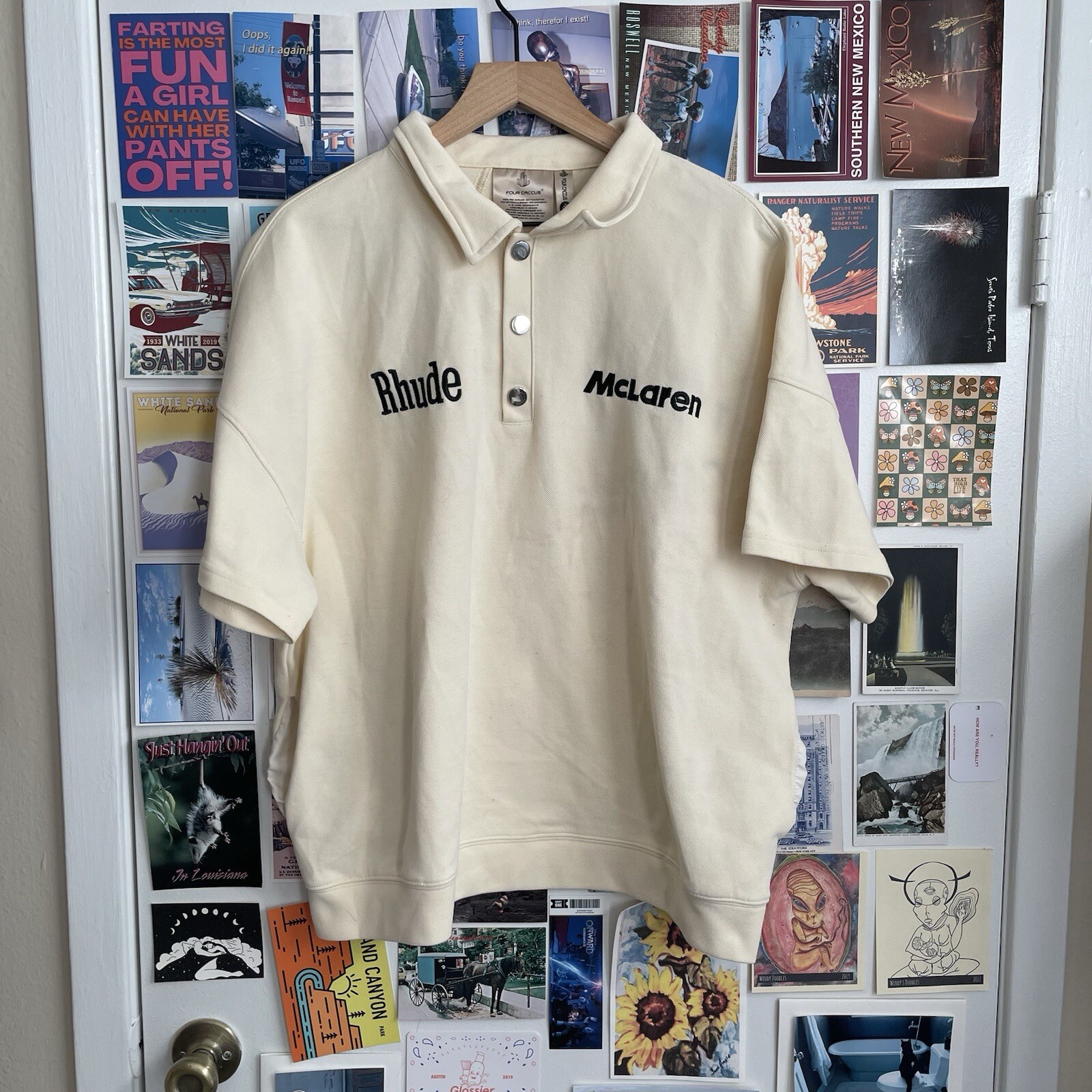 Four caccus Rhude McLaren race sports button up medium FLAWS Has Flaws hard to see but black or blue faded mark/ stain. Seems like detergent stain Pit to pit 24.5 Length 25