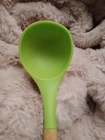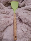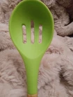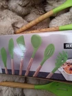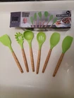 The Robert Irvine Green Silicone Kitchen Cooking Utensil Set includes 6 items with black silicone material and wooden handles. The set features slotted spoons, skimmers, ladle, turner, and spatula. Perfect for cooking and kitchen use, these utensils are durable and easy to handle. Solid (not hollow) wooden handles. Enjoy FREE SHIPPING:-)
