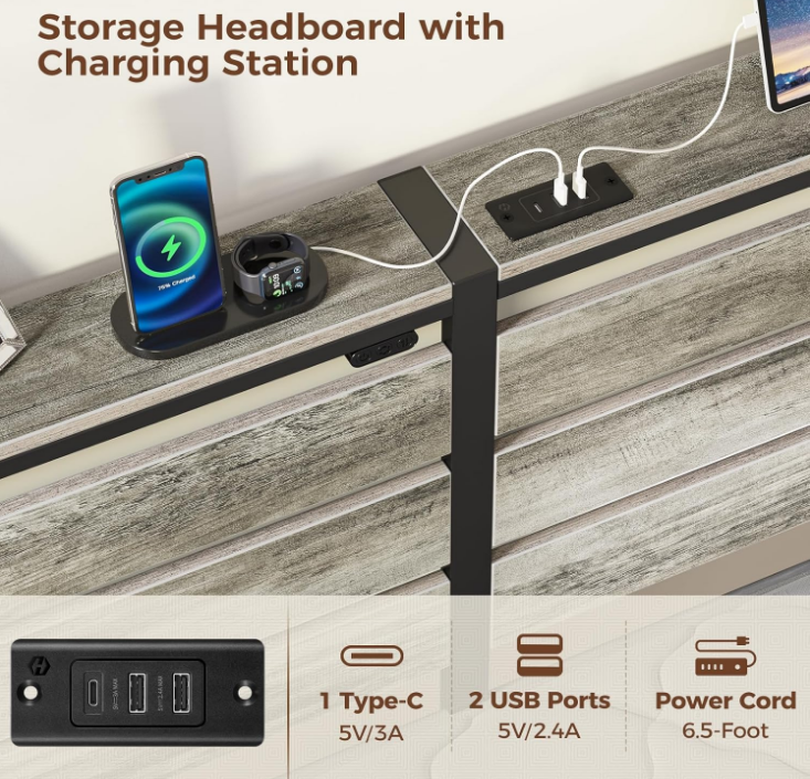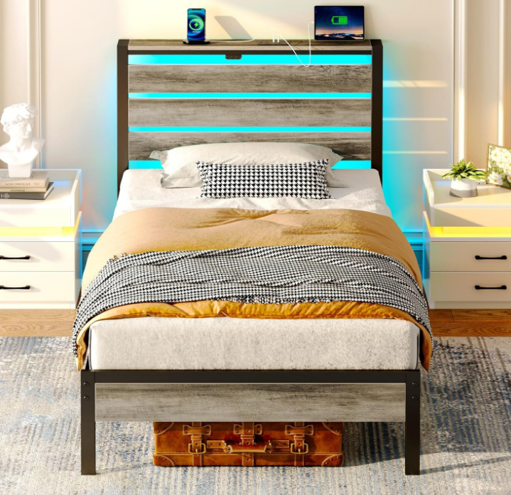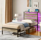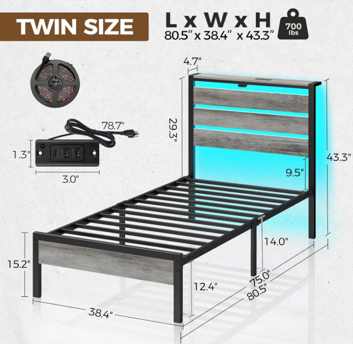 Rolanstar Bed Frame Twin Size with USB Charging Station, LED Bed Frame with Wood Storage Headboard, Light Grey Metal Platform Bed with Under Bed Storage, No Box Spring Needed, Noise Free Size Twin Product Dimensions 80.5"L x 38.4"W x 43.3"H Special Feature Storage Headboard, LED strips, Charging Station Color Light Grey Finish Type Powder Coated Material Metal Style Modern Maximum Weight Recommendation 350 Pounds Item Weight 17.3 Kilograms About this item Headboard Storage Shelves: Rolanstar bed frame headboard shelves offer a convenient storage solution, keeping essentials within easy reach and providing an additional space for decorating your cherished home Convenient Charging Station: The Rolanstar metal platform bed features 2 USB ports and 1 Type-C port, providing convenient charging options for your cell phone and allowing the use of a book light while you relax in bed Multi-functional LED Bed Frame: Experience sophistication with the Rolanstar metal bed frame, heightened by vibrant multi-colored RGB LED light strips. Utilize the mobile app to explore a spectrum of over 60,000 colors, and customize brightness, color, mode, and timer settings according to your preferences. Enhance the overall experience by syncing the LED lights with music, creating a romantic and dynamic party atmosphere Under-Bed Storage: The thoughtfully designed 12.4-inch under-bed storage maximizes space, providing ample room for belongings and effortlessly contributing to a neat and organized bedroom Sturdy Bed Frame: With 13 secure heavy-duty metal slats, this platform bed ensures stability, eliminating any wobbling or shifting. Supported by nine sturdy legs, it facilitates even weight distribution, preventing mattress sagging for an improved sleep experience and refreshed wake-ups. Remarkably sturdy, with a weight capacity of 700 pounds . We offer FREE shipping on all orders! . We ship within Five business days of payment, usually sooner. . We use a selection of shipping services such as UPS, FedEx, USPS etc. . We only ship to the lower 48 states, no APO/FPO addresses or PO Boxes allowed. . Local pickups and combined shipping options are not provided at this time. . You can return a product for up to 30 days from the date you purchased it. . Any product you return must be in the same condition you received it and in the original packaging. Please keep the receipt. . Your satisfaction is a wonderful reward for our efforts. Please assist us by leaving a positive review if you feel pleased with our service. . In the event that you encounter any difficulties related to your order, please do not hesitate to reach out to us directly through the Messaging system on the Ebay platform. Kindly consider opening a COMPLAINT or a RETURN REQUEST as a last resort, only after all other possible measures have been attempted and we have been unable to provide you with assistance. . We will get in touch with you within 24 hours and make every effort to ensure your satisfaction. . Please rest assured of our service quality.
