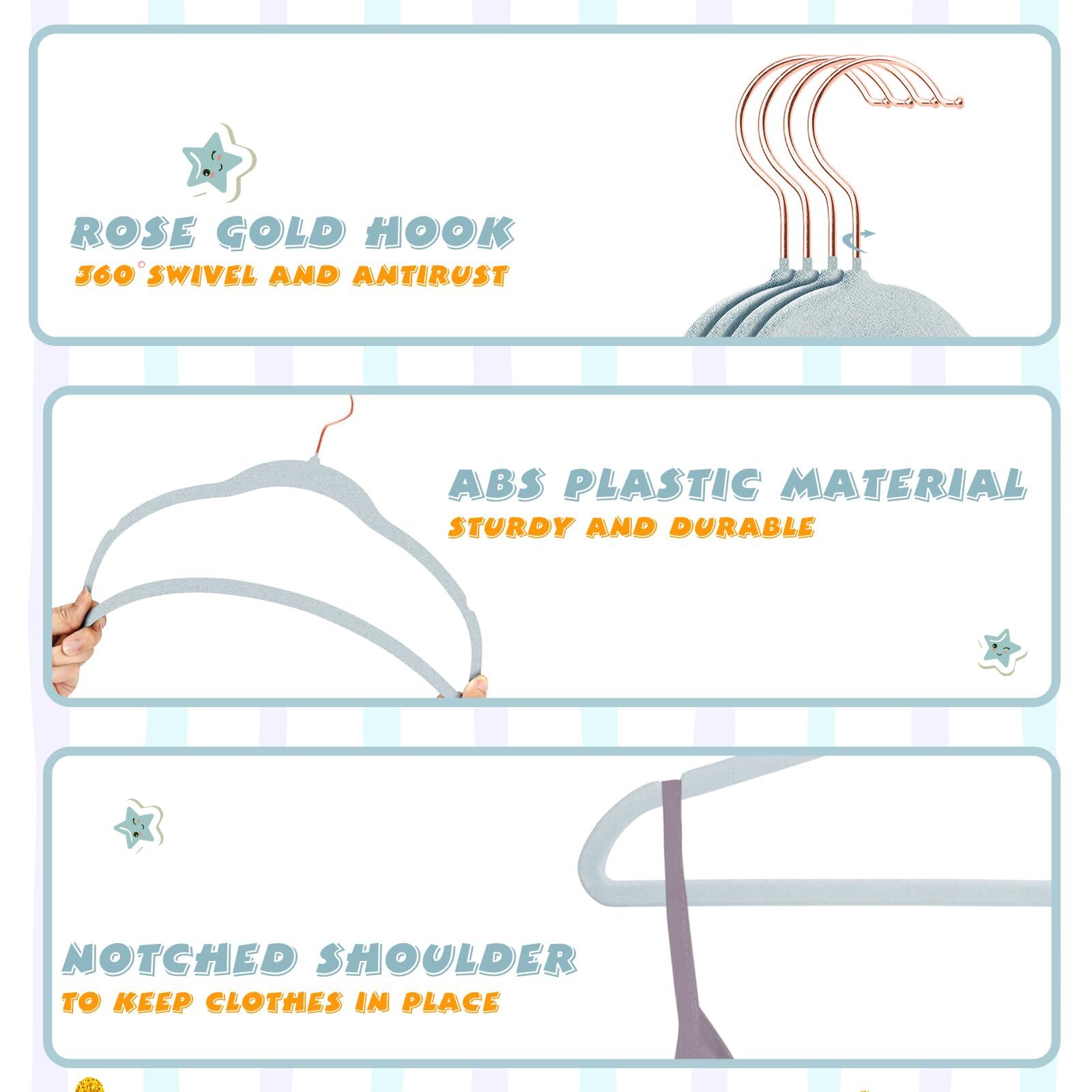 We offer Free Shipping on all orders!! Welcome to my store, The Smart of your choice and satisfaction guarantee. Baby Velvet Hangers with 360° Swivel Rose Gold Hook, 10.95" Non-Slip Toddler Hangers, Ultra Thin Space Saving Children's Clothes Hanger, 15 Pack (Blue) Product Description Features [Baby Velvet Hangers]: The velvet baby hangers are made of premium quality ABS plastic and covered with non-slip soft plush velvet surface, feels so comfortable to the touch, and helping your clothes do not cause any shoulder bump and get wrinkled. [Rose Gold Hook]: Each felt hanger is topped with rose gold hook that rotate freely in all 360 degrees, making it convenient and flexible whenever you want to hang or access children's clothing. The shiny rose gold hook will add a little sparkle to your closet. [Non-slip]: The kids velvet hangers has contoured curve shoulder shape that keep toddler clothes in good shape, V-notches on the two ends of hangers to keep your kids' clothes in good position and protect them from slipping off. [Space Saving]: The 10.95'' (27.8cm) x 6.8'' (17.3cm) velvet coat hangers are light but sturdy, and the 0.2'' (0.5cm) slim design maximizes closet space, helping you add more extra space to hang more clothes in your closet. [Notes]: Before using the baby velvet hangers, use a hair dryer to blow or over the water and then air dry, can effectively remove the surface floating hairs. Due to the characteristics of flocking hangers, the newly produced hangers and their bags will stick to a little floating hair, which is a normal phenomenon, not a quality problem, please feel free to buy. If you have any questions, please feel free to contact us and we will provide you with the service. Payment Policy - Payment managed by eBay. - We accept payment via PayPal, which provides a high level of security for buyers and sellers. All major credit cards are accepted through eBay. - Orders will be processed and shipped only after payment is received. - If you wish to cancel an order, please contact us as soon as possible. Orders that have already been shipped cannot be canceled. Shipping Policy - We do not ship to a different address. We will ship to the address you provide on eBay only. Please check your address before purchase. - Items are dispatched within 24 hours (except weekends and holidays) and shipped from the US. - It should take 3-5 business days for the product to reach your destination (Saturday and Sunday excluded). - We use a selection of shipping services such as UPS, FedEx, USPS, etc. - We ship only to the 48 contiguous states of America. We do not ship to Hawaii, Puerto Rico, Alaska, US Protectorates, APO/FPO addresses, and PO Boxes. Local pickups are not offered. - If it takes any longer than that, please do not hesitate to contact us to resolve the issues. Returns Policy - This product comes with a 30-Day Money Back Guarantee. - If you receive an item and it doesn't work properly or you don't like it for any reason at all, - We have a 100% refund/return policy. We will ship you a new item or refund your money for the full sale amount. - For all returned products, buyers MUST contact us for the returning address.