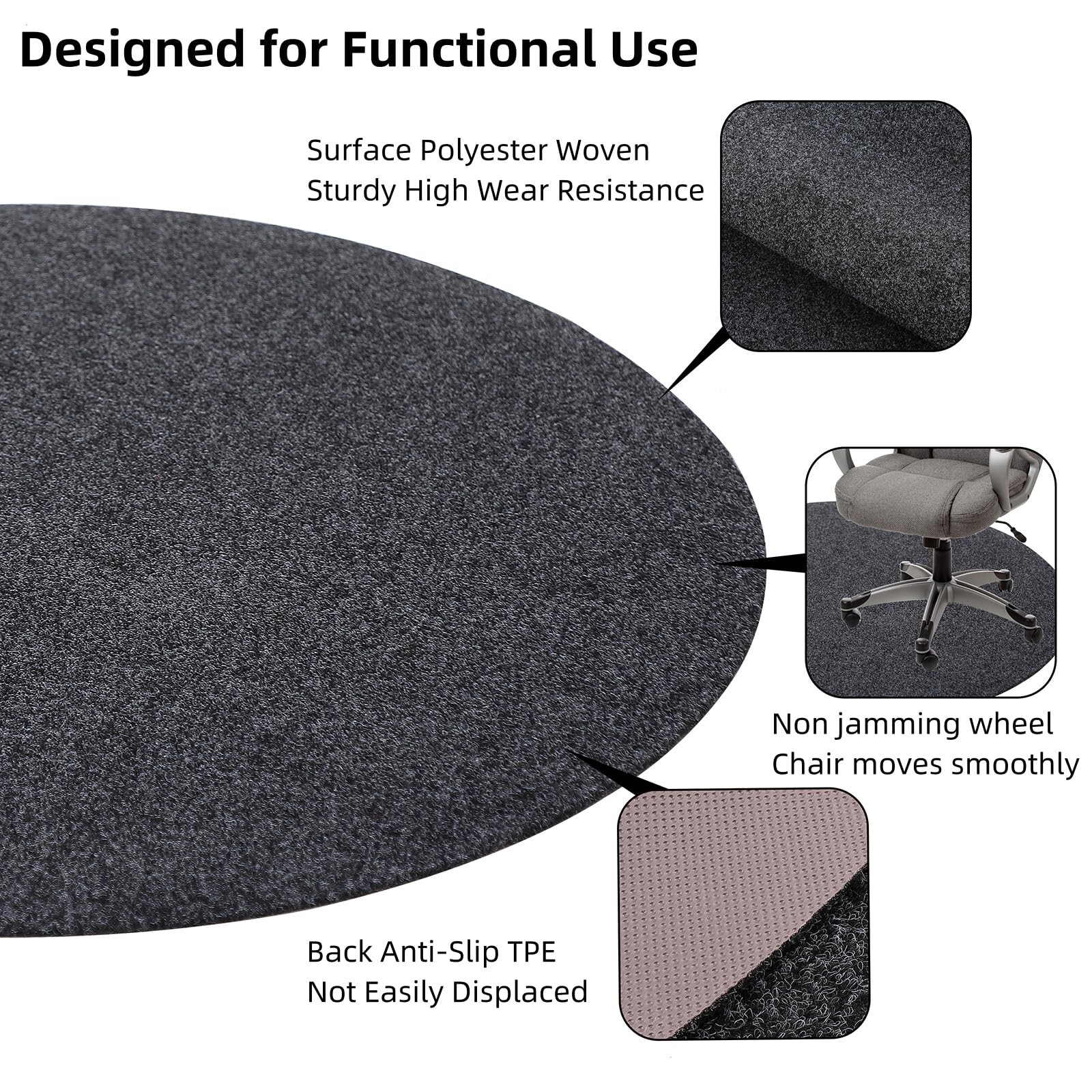 Office Chair Mat, Round Floor Mat for Home, 39inch Diameter Low Pile Heavy Duty Non Slip Multi-Purpose Desk Chair Mat Rug for Hardwood Tile Floor Carpets (Dark Grey) ✓ Free 60 Day Returns ✓ Free Express Shipping Description: PATTERN (TYPE): Round type, WEIGHT: about 3.3lb/1500g, SIZE: about 39x39in/100x100cm, THICKNESS: about 0.23in/6mm, MATERIAL: 100% POLYESTER FIBERS/front ; PLASTIC/back. ANTI SLIP AND STADY——This mat prevents the floor from being damaged by chair legs and casters.Back side adsorption processing, mat does not shift even if the chair is moved.It is thin enough allows smooth movement of the chair casters, it isn't to catch the foot or caster on the mat. SAFETY NO SMELL——100% recyclable materials. No smell, BPA phthalate free, and free from thin, lead and other metals. NO BEND, NO CREASES——The polyester and acrylic resin materiales in the chair mat helps it retain its straight shape and lessens the possibility of curves in the edges of the mat.Even when rolled up for a long time, the mat will lay flat once it's in use. FREELY CUTTABLE——It can be cut freely according to the place of use and application, and it is convenient to use. EASY TO CLEAN——Even if you apply a vacuum cleaner, it will not be sucked up, making it easier to clean.If it gets dirty, it can be washed in a washing machine repeatedly. PERFECT FOR HARD FLOORS/CARPETS——Protect your flooring from scratches and dust of any kind with this perfect office floor matfor hardwood floors, tile, laminate, vinyl and linoleum.It can also be spread on the carpet. WIDE USAGE—— Office chair,living room,sofa,bedroom,hardwood floors, wedding party, home decor, outdoor activities. This Round rugs will make your home/office more fashionable and warmth, or it will be a wonderful gift for relatives, parents and so on. PACKAGE INCLUDES——1x Chair Mat. Features: MATERIAL--This chair mat was made of polyester, which are soft touch, wear-resistant. It's a comfort floor carpet, will be your ideal partner which can help you relieve foot fatigue. WILD USAGE--39-inch Diameter, suitable for office chair, computer chair, rolling chair, living room, sofa, bedroom, wedding party, home decor, outdoor activities. This round rug will make your home/office more fashionable and warmth, or it will be a wonderful gift for relatives, parents and so on. Anti-Slip & Stady-- Made of upgraded version adsorption material, prevents mat from slipping, and the surface is a soft loop-like fabric like a carpet. Even if you move the chair, it will not scratch the floor, with excellent noise reduction. Designed for use on all hard floor surfaces such as tile, laminate, hardwood etc. It can also be spread on the carpet. The Chair to Move Easily-- the thickness of about 0.16" enough to protect floors from scratches, the chairs and casters won't get caught. Large size, It allows your office chair casters to move easily while carrying out daily tasks, but has enough grip to maintain controlled rolling so the chair doesn't skid around. and helping reduce the risk of leg fatigue. Warm Tips-- If the mat has creases, you can try to iron it with ironing machine. Or soak it in (hot) water for about 20 minutes, then let it air dry on a flat surface. Product Details: Material: Polyester+TPE Brand: NCONE Size: 39"x39" Color: Dark Grey Style: Modern Shape: Round Product Dimensions: 39"L x 39"W x 0.23"Th Surface Recommendation: Carpet Corner Style: Rounded Manufacturer: NCONE Material: Polyester+TPE Brand: NCONE Size: 39"x39" Color: Dark Grey Style: Modern Shape: Round Product Dimensions: 39"L x 39"W x 0.23"Th Surface Recommendation: Carpet Corner Style: Rounded Manufacturer: NCONE UPC: 791742975694 Item Weight: 1.98 pounds Item model number: g68998134p Date First Available: July 17, 2021
