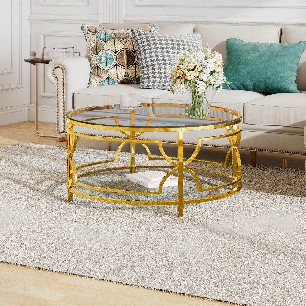30.7" Round Tempered Glass Coffee Table - Gold Geometric Metal Frame with Lower Shelf Two Color Options Available: Black / Transparent Glass Elevate your living space with this sleek and sophisticated round coffee table, where modern design meets everyday functionality. Crafted with premium tempered glass and a luxurious gold-finish metal frame, it’s the perfect centerpiece to tie together contemporary, modern, or glamorous interiors. Key Specifications Dimension Type Length (in) Width (in) Height (in) Weight (lbs) Assembled Product 30.70 30.70 18.50 38.02 Packaging 36.22 34.88 8.78 46.74 Product Highlights 30.7" Tempered Glass Top : The generously sized, shatter-resistant tempered glass surface blends style and practicality. It’s perfect for placing coffee mugs, displaying decorative accents, or using as a functional centerpiece for everyday gatherings. Luxurious Geometric Metal Frame : A striking geometric base adds architectural flair and visual depth to your living room, turning a simple coffee table into a statement piece that catches the eye. Elegant Gold Finish : The high-quality gold finish on the metal frame exudes glamour and sophistication, seamlessly complementing modern, contemporary, and even transitional home decors. Built-In Lower Shelf : Maximize storage and display space with the convenient lower shelf. Ideal for stowing books, magazines, throw pillows, or additional decorative items, keeping your living area tidy and organized. Open & Airy Design : The combination of transparent glass and an open metal frame creates a light, airy aesthetic that enhances spatial perception, making small or large rooms feel more spacious and uncluttered. Durable Construction : Crafted from premium glass and sturdy metal, this coffee table is built to withstand daily use, ensuring long-lasting durability and stability for years to come. Warranty & Return Policy We stand behind the quality of our products! Enjoy 1-Year Manufacturer Warranty against defects in materials and craftsmanship. Additionally, we offer a 30-Day Free Return & Exchange Policy – if you’re not completely satisfied with your purchase, simply return it within 30 days for a full refund or exchange, no questions asked. About This Product Available in two versatile color options (Black / Transparent glass), this coffee table is designed to adapt to your unique style. Whether you’re furnishing a cozy apartment or a spacious living room, its compact yet functional size (30.7" diameter x 18.5" height) fits seamlessly into any space without overwhelming it. Easy to assemble with included instructions and hardware, this coffee table lets you transform your living space in no time. Upgrade your home with a piece that balances beauty, functionality, and peace of mind – order yours today! Note: Color option selected will determine the glass top color (Black or Transparent). All other features, including the gold metal frame and lower shelf, remain consistent across both options.