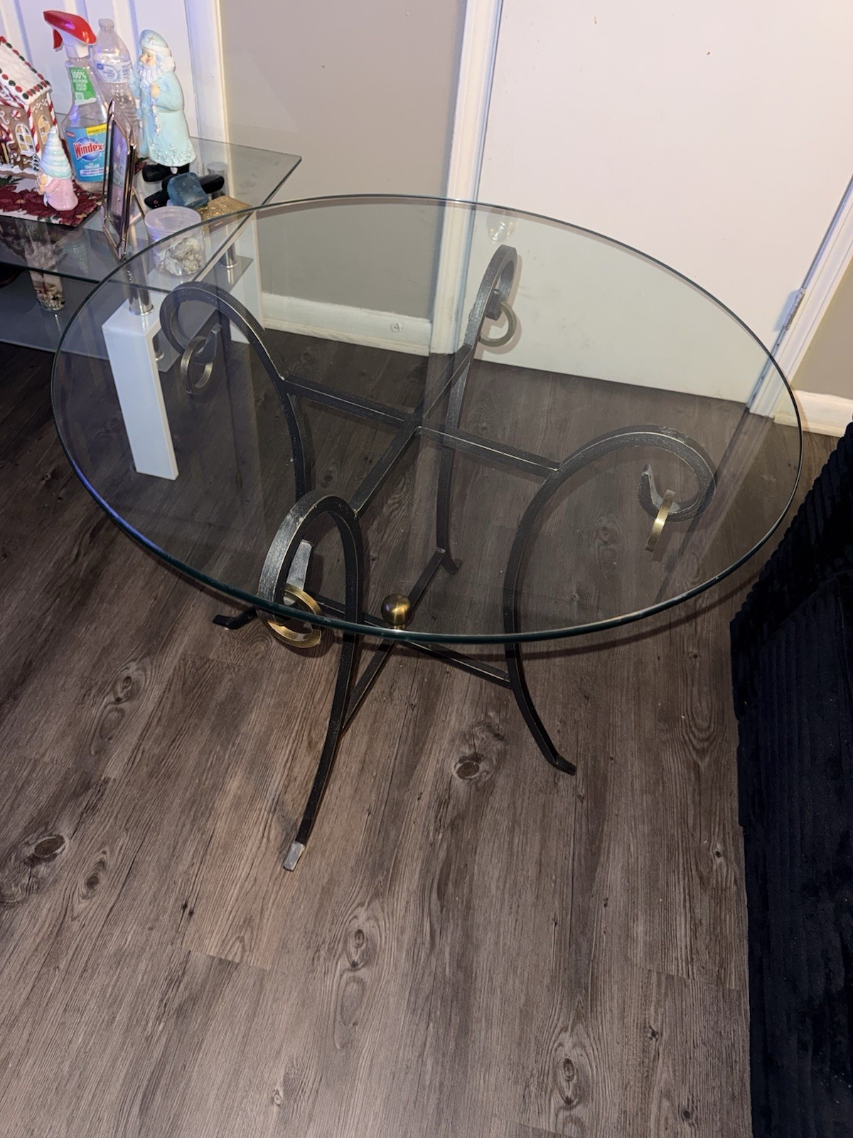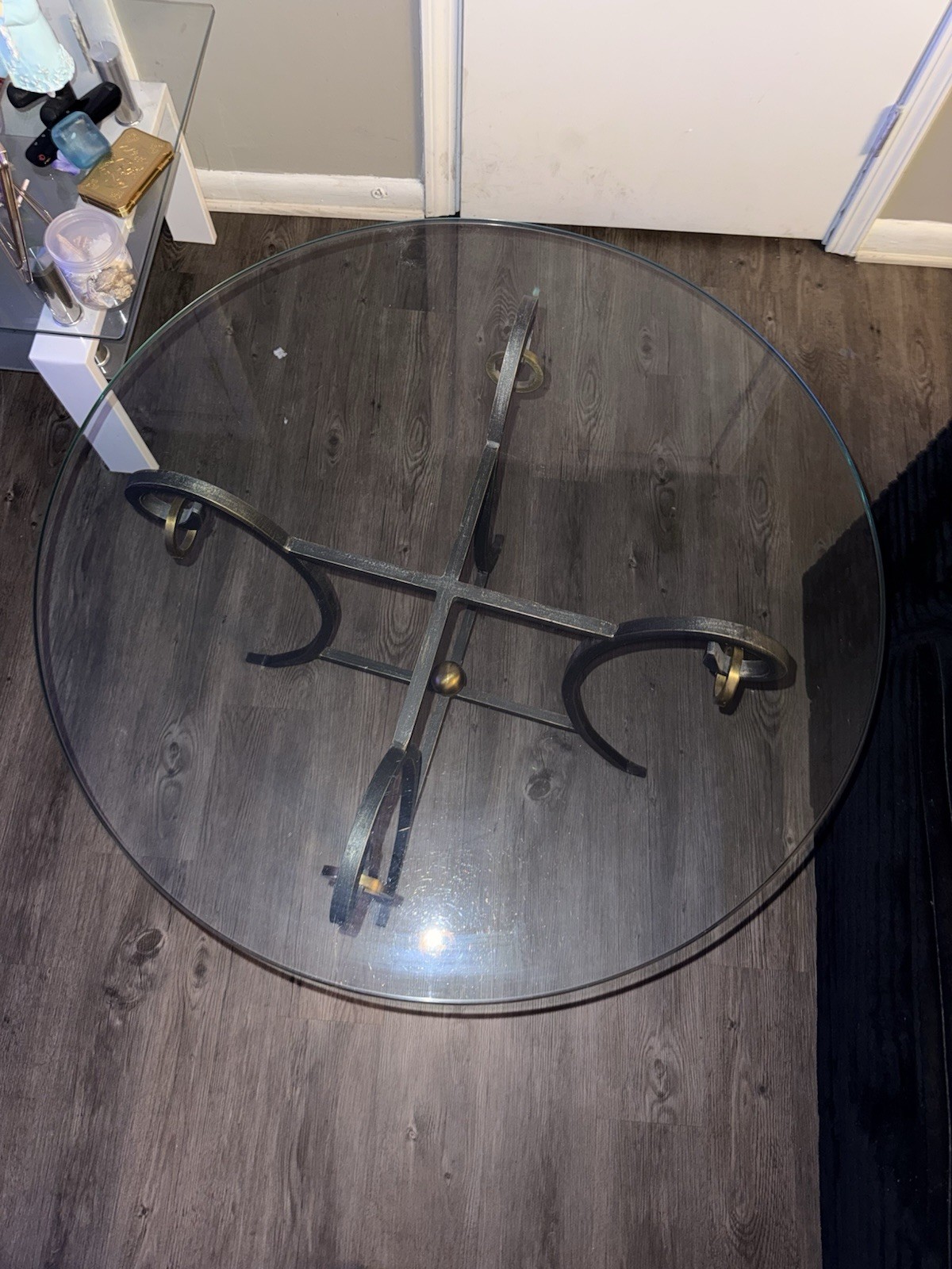 Round Glass Coffee Table with Metal Base and Gold Black Decorative Accents