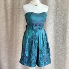 Y2K Iridescent Dress Description: absolutely stunning, vintage Y2K, teal and purple iridescent strapless floral embroidered detail tie waste mini dress by Ruby Rox in US Junior size 7. self is 60% polyester and 40% nylon, and lining is 100% polyester. Condition: fair condition overall. No visible signs of wear, but unfortunately the zipper is broken and needs to be replaced. It is finicky, and will zip properly sometimes, but will not zip properly other times. Price has been adjusted to reflect this flaw. Lay flat measurements: - pit to pit: 15 inches - waist: 14 inches - hips: 23 inches - neckline to hem: 27.5 inches - waist to hem: 18 inches Mannequin measurements: - bust: 32 inches - hips: 24.5 inches - waist: 34 inches #Y2K #Vintage #IridescentDress #Glam #PartyDress
