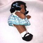 This is a sweet vintage doll from Russ Berrie and Company Inc. She is named "TOFFEE" and she comes dress in a blue and white checkered dress with a white undergarmet that is trimmed in lace that peeks out of the arm holes and neckline. She has white socks and black shoes that are attached. Her hair is black yarn that is braided into four pigtails and I believe her head is styrofoam under the fabric. Toffee's original Russ tag reads "My name is Toffee and I want you to know that I'll be your friend wherever you go. You'll recognize me by my pigtails and bows. I'm as sweet as can be from my head to my toes." She measures approximately 9 inches tall and is about 8 inches from tip of her hand to the tip of her other hand and is number 667. If I had to guess, I would date her to the 1970's. Doll is in good vintage pre-owned condition. She appears to be missing one blue bow on her left side (see 2nd photo). There are three on the right and I am assuming they were symmetrical and there should be three on the left. She comes with her original Russ tag still attached. There is some writing on the back of the tag (see 7th photo). I did note a small spot on the back of her dress near the hem (see last photo). Please review and enlarge all photos as they contain additional details, views and measurements. Shipped via USPS Ground Advantage.