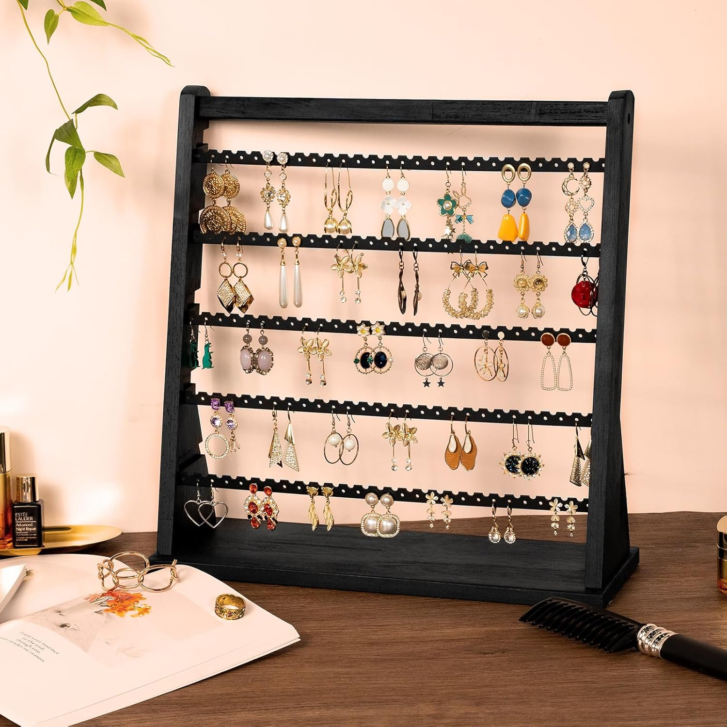 This rustic wood earring holder is a game unfolded! The sturdy 5-tier design holds up to 140 pairs with ease, keeping everything visible and tangle-free. The weathered white finish adds a charming farmhouse touch to any dresser or vanity. No more digging through boxes—it keeps my collection organized while looking like decor. Perfect for studs, hoops, or dangly earrings, and the slanted poles make grabbing pairs effortless. Love how it saves space while showing off my jewelry!