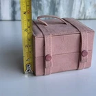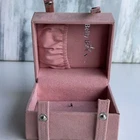 This is a small pink jewelry box with compartments and a snap closure. It is made of faux leather and velvet, suitable for storing various types of jewelry like necklaces, bracelets, and earrings. The travel jewelry case includes small compartments for organization and is designed for women. It is not vintage or personalized, and is suitable for keeping jewelry safe while traveling.n