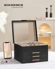 Brand SONGMICS Color Graphite Black + Gold Material Engineered Wood Special Feature Durable, Jewelry Organizer Style Modern About this item [Storage, 4 Layers] Keep all your jewelry organized in this jewelry box—small pieces of jewelry go in the various slots of the top layer, and big jewelry goes in the bottom 3 drawers [Clear Glass Lid] The see-through glass lid of this jewelry organizer allows you to see and find your favorite jewels at a glance while protecting them from dust, keeping your jewelry ready to wear and clean [Chic & Durable] Elegant black and gold colors, shiny metal handles, soft velvet lining, neat stitching, quality PU, and sturdy MDF—all these elements combined make this jewelry case stylish and durable enough for your ever-growing jewelry collection [Perfect Gift Idea] Gift this original design jewelry box to your loved ones for their birthday or anniversary to surprise them! Or, treat yourself to this fancy jewelry box—you deserve it! [Versatile Use] This modern jewelry holder looks nice whether displayed on the dresser of your bedroom or your cloakroom to organize your pins, necklaces, rings, bracelets, and other accessories On Feb 14, 2025 at 17:49:48 PST, seller added the following information: