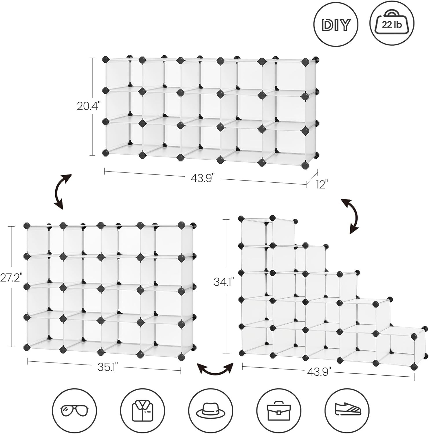 About this item 【MAKE FULL USE OF YOUR SPACE】 Designed to utilize floor space, this shoe rack can be stacked and customized for your space and preference, maximizing every inch of your entryway, living room, closet, attic, space under the stairs, or a spare corner 【UNLOCK ITS POTENTIAL】 Whether you prefer a 4 x 4 storage unit, step-shaped shelving, 2 units separated for different purposes, or other shapes to adapt to your space, this shoe rack can be customized within the limit of included parts 【QUALITY MATTERS】 Featuring quality ABS connectors, a sturdy metal frame, and water-proof, easy-to-clean PP plastic sheets in timeless transparent, each slot can hold up to 22 lb; plus, anti-tip devices are included to give your collection a safe perch 【EASIER THAN YOU THINK】 With a mallet and illustrated instructions included, assembling this shoe storage is joyful—almost like playing with building blocks! Moving? This disassembly-friendly unit makes it easy to relocate! 【WHAT YOU GET】 A shoe rack with an expandable design for more shapes, that also works as a storage organizer for clothes, a shoe cubby in the closet, or a shoe organizer elsewhere