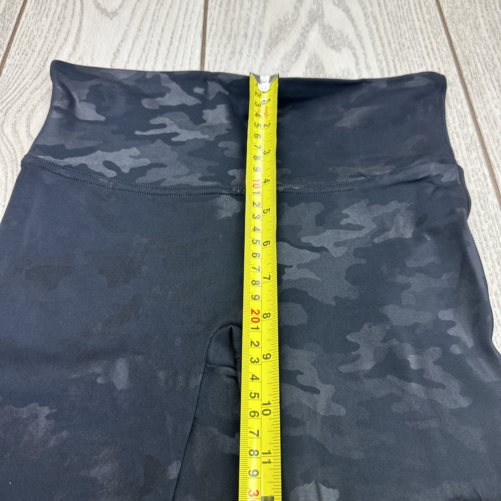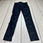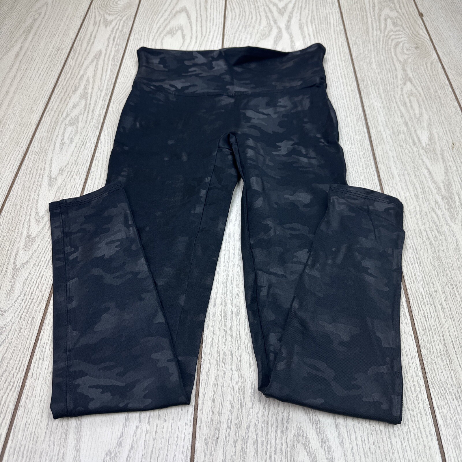 Add some edginess to your casual wardrobe with these Spanx leggings in a black camouflage pattern. The high-rise and slimming features provide a flattering fit, while the faux leather material gives off a stylish and trendy vibe. These leggings are perfect for walking around town, and the blended fabric wash ensures durability. The waist size and inseam can be viewed in the pictures for accurate sizing.
