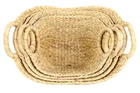 Use in your living room as home storage for throw blankets and pillows, bathroom for towels, or anywhere in the house as decorative baskets. This item ships in 1 carton. Due to the handmade nature of these, there will be slight color, shape, and size variations, as well as loose fibers. Suitable for indoor use only. This item ships fully assembled in one piece. Maximum weight limit is 5 lbs. Made in Vietnam. This brown colored basket organizer comes as a set of 4. Contemporary style. CONTEMPORARY THEME Embrace artistic expression with a style that highlights bold designs with sleek lines, neutral elements, and a minimalist aesthetic MADE OF SEAGRASS These wicker storage baskets are woven using dried water hyacinth fibers BROWN AND WHITE UNFINISHED FINISH Natural light beige water hyacinth rattan is braided into staggered oval shapes with curved silhouettes and circular handles FEATURES OVAL STORAGE BASKET Four nesting, oval, natural wicker baskets with white color blocking and easy-carry handles 4 PIECES CONVENIENTLY SIZED This item measures 17L x 15W x 17H, 15L x 14W x 15H, 13L x 13W x 14H, 12L x 11W x 13H inches, and weighs 6 lbs