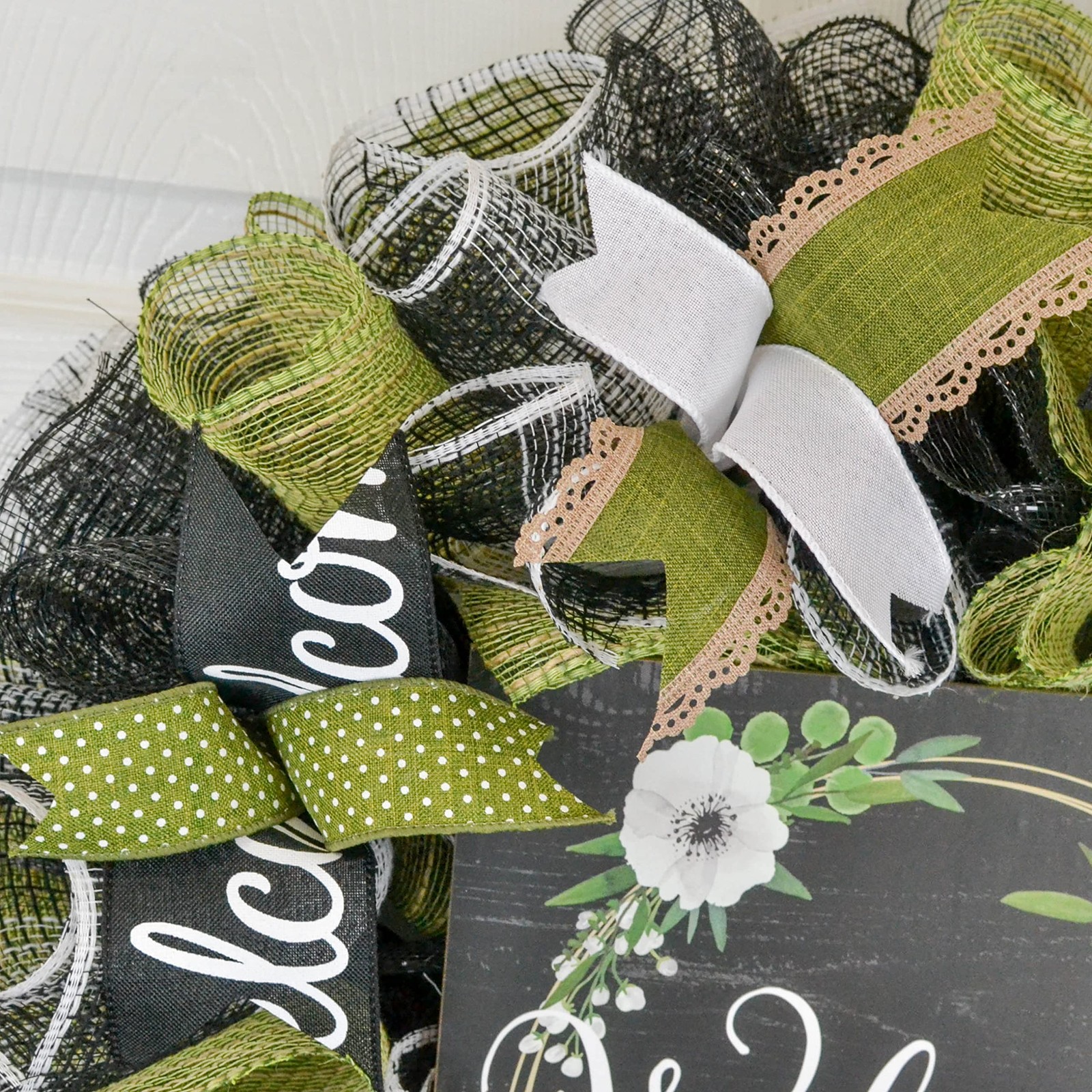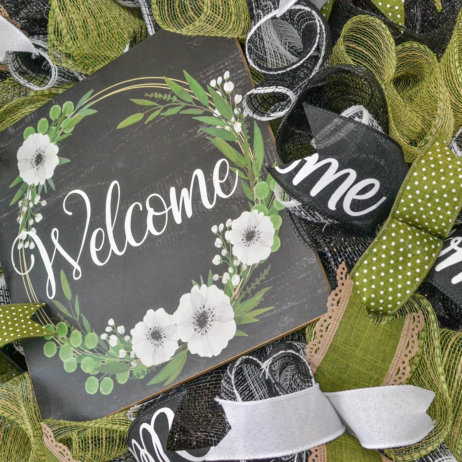 This welcome wreath will make a wonderful addition to your indoor or outdoor home décor. Use it for your own decor, or a gift for someone special. Thank you so much for visiting my shop and for considering pieces that allow my passion to make your home even more beautiful. Please message me with any questions before purchasing. This wreath measures approximately 24 inches round and approximately 5" deep This wreath is ready to ship and is made with black, jute and white mesh and accented with coordinating ribbons to showcase the wooden Welcome sign in the center (that is removable) Want something more custom or have questions? Send me a message...the backbone of my business is custom creations! Purchase with confidence in a seller with excellent reviews and over 15,000 sales between all selling venues. Indoor and outdoor pieces but my wreaths do appreciate a little shelter from the elements to stay in pristine condition.