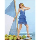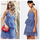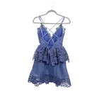 Self Portrait Lace Trim Peplum Mini Dress in Cornflower Blue. Low back with crossing ribbon straps. Plunge V neck. Peplum tiered skirt. Back zip. Pockets New without tags Size 2 (approx, on hanger) pit-pit 15” flat waist 13.5” length 34” Color: Blue cocktail party occasion event dressy open back lace crochet strappy feminine Revolve date night prom night out