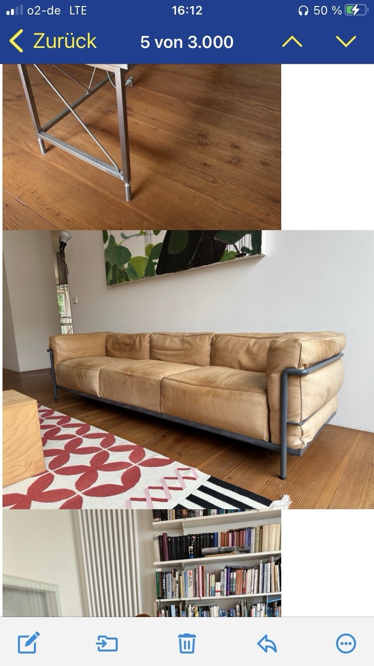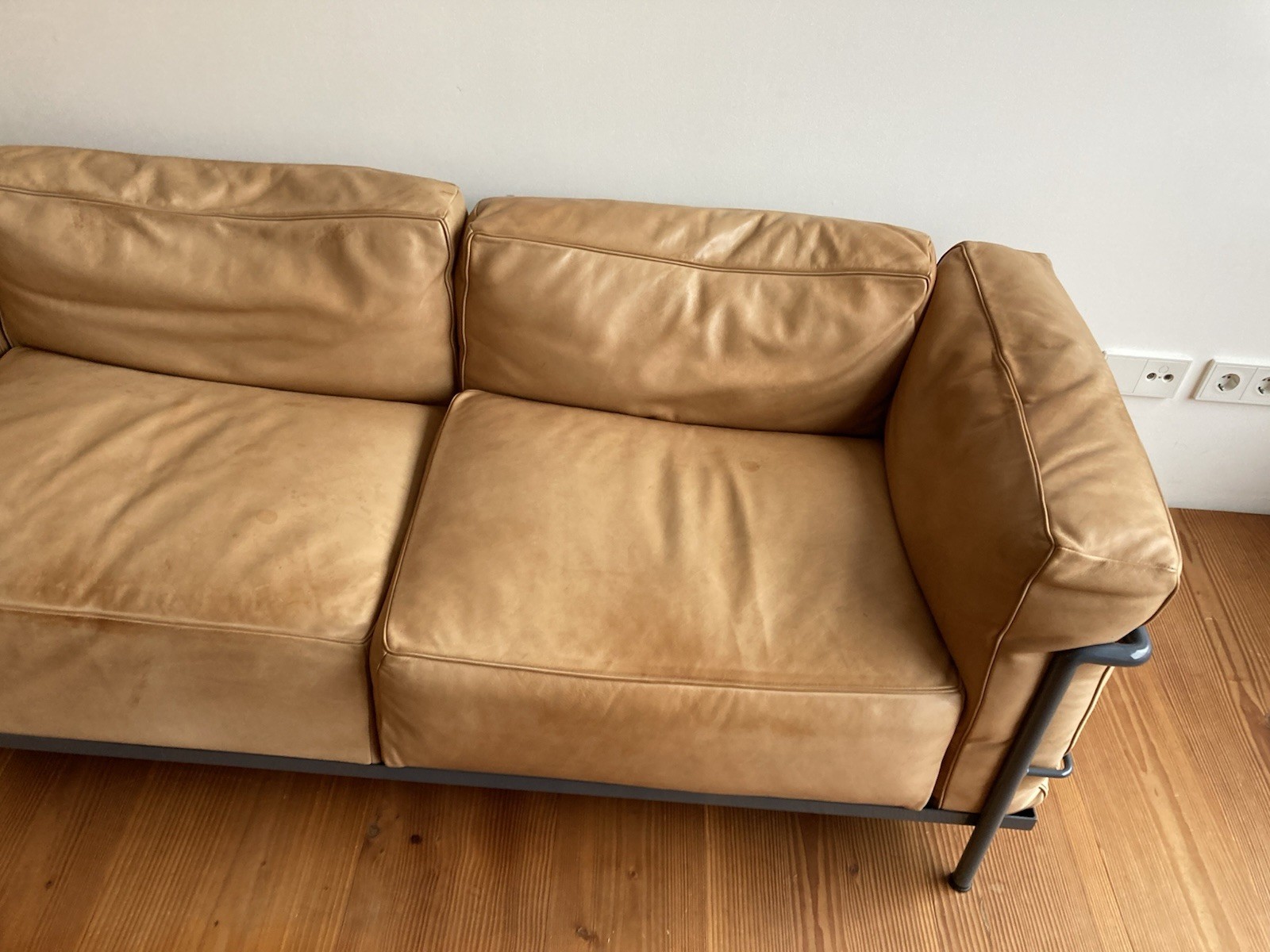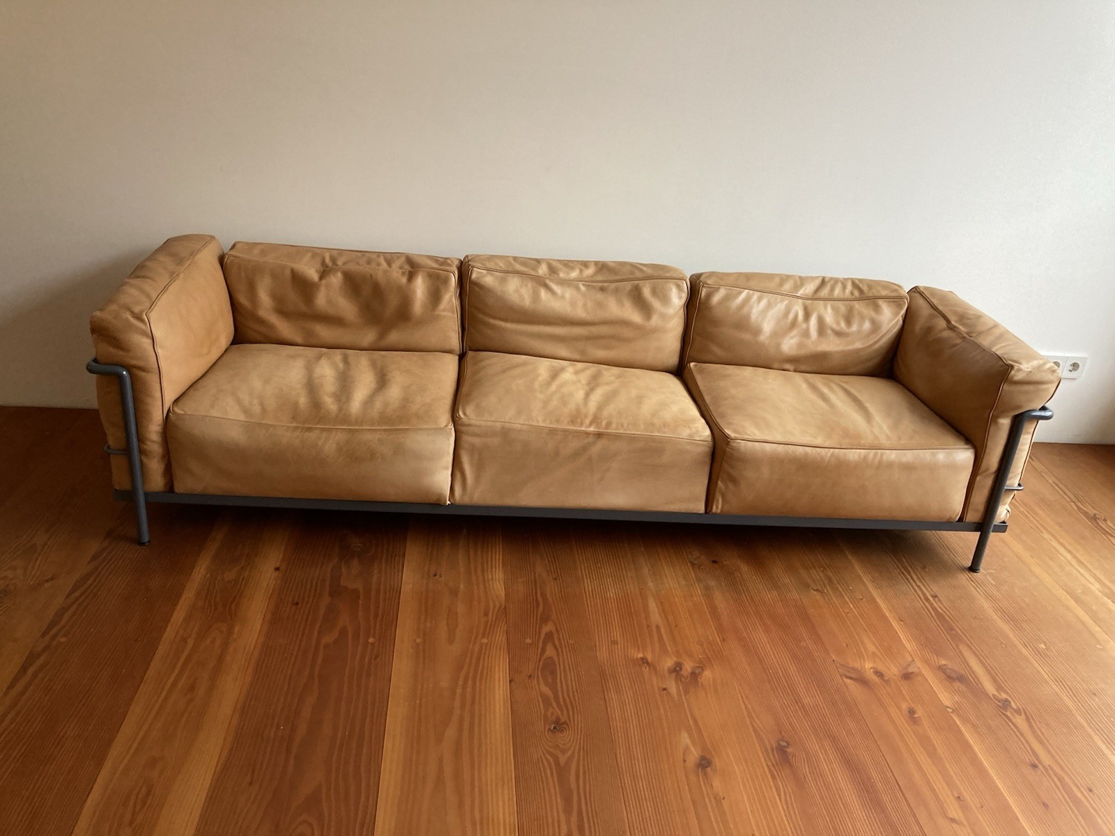 erkaufe mein Le Corbusier LC3 Sofa von Cassina in wunderschönem Cognac-Leder. Das Sofa ist ein echter Designklassiker und besticht durch: • Originales Cassina-Stück mit Authentizitätsgarantie • Hochwertiges Leder in warmer Cognac-Farbe • Charakteristische Stahlrohr-Konstruktion • Drei bequeme Sitzplätze Das Leder hat eine wunderschöne Vintage-Patina entwickelt, die dem Sofa seinen besonderen Charakter verleiht. Der Zustand ist sehr gut und entspricht dem Alter des Stücks. Ein zeitloser Designklassiker für dein Wohnzimmer! Info Stil Vintage Marke Cassina Höhe 62 cm Breite 237 cm Tiefe 73 cm Sitzhöhe 43 cm