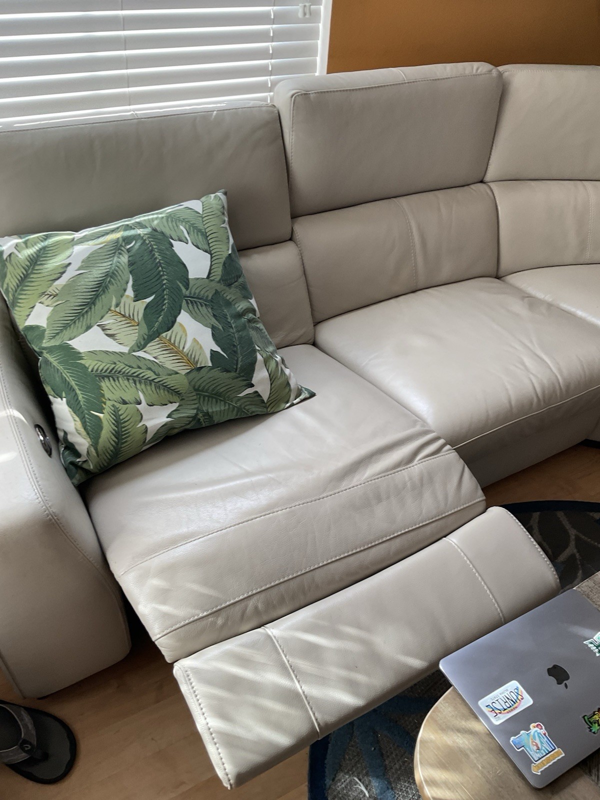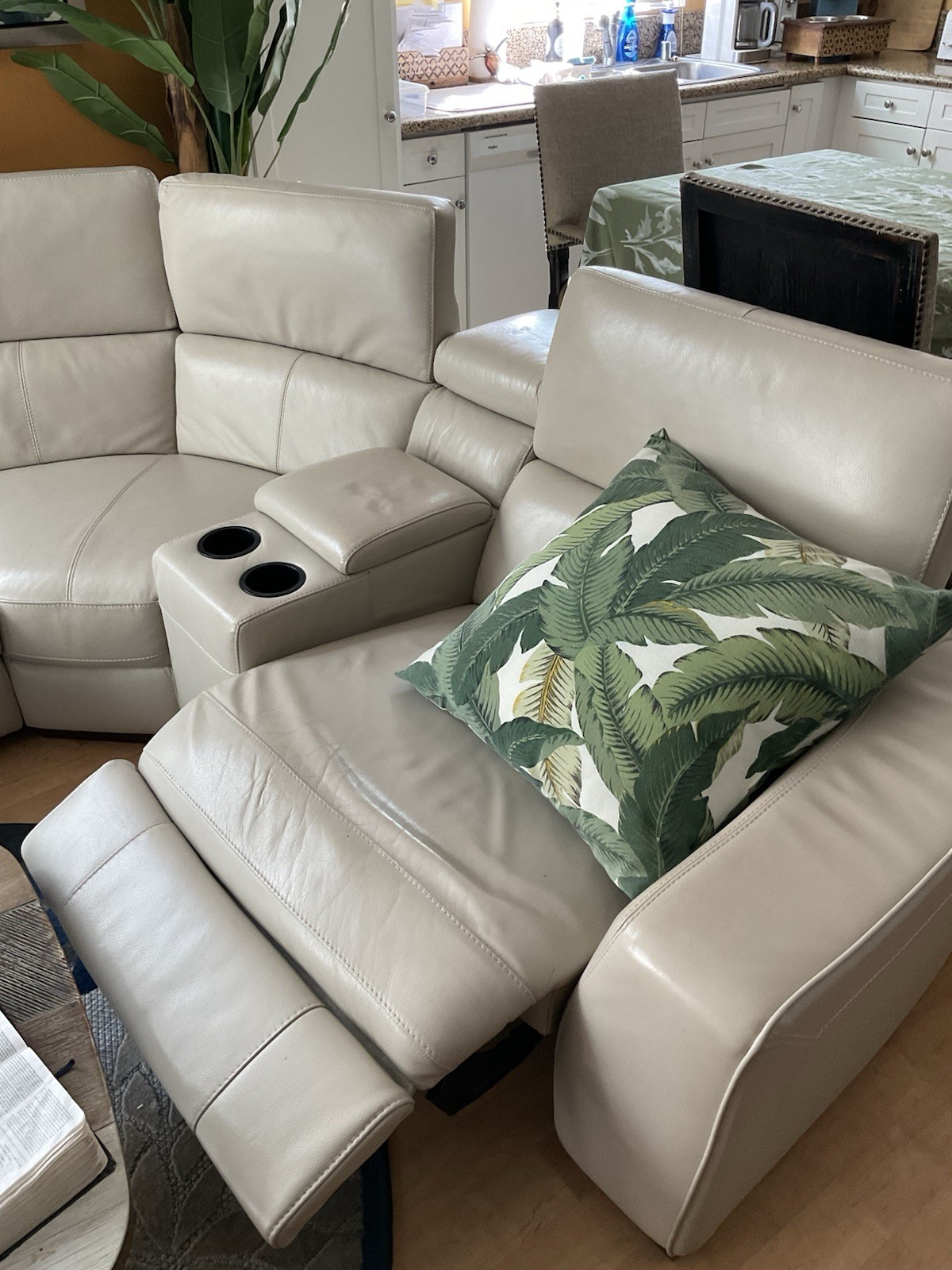 The Sectional Leather Couch is a luxurious and modern piece of furniture for the living room. This ivory-colored couch features a high back design, comfortable leather upholstery, and a sleek wooden frame. With a seating capacity of 6 adults, this contemporary recliner offers a relaxing and stylish option for any home. It comes with a 1-year manufacturer warranty and easy care instructions to maintain its appearance. The couch is 8 ft in length, 6 ft in width, and 40 inches in height, providing ample space for a cozy seating experience.
