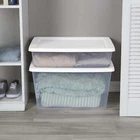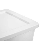 Get organized with the modern Sterilite Clear Storage Box line! The Sterilite Set of (2) 28 Quart Storage Boxes is a convenient two pack of the popular 28 Quart size, and is ideal for a variety of basic and lightweight household storage needs. It features a clear base that allows contents to be easily identified and an opaque lid that snaps firmly onto the base to keep contents contained and secure. This storage box is ideal for organizing and storing towels, clothing and linens and fits conveniently underneath the bed for out of sight storage. Recessed lids allow containers of the same size to securely stack on top of each other for efficient use of vertical storage space. When storing items away, use good judgment and don’t overload them or stack them too high; be mindful of the weight in each box and place the heaviest box on the bottom. The overall assembled dimensions of this item are 23" L x 16 5/8" W x 5 7/8" H. Sterilite Set of (2) 28 Quart Storage Boxes, Clear Plastic Storage Bin with Snap-on Lid, White Outside Dimensions: 23" x 16 5/8" x 5 7/8" Interior Dimensions at bottom: 20 3/8" x 14 1/8" x 5 1/8" Opaque lid snaps firmly onto the base and provides a grip for easy lifting Clear base allows contents to easily be viewed and located Recessed lids allow same size storage boxes to securely stack upon each other BPA-free and phthalate-free