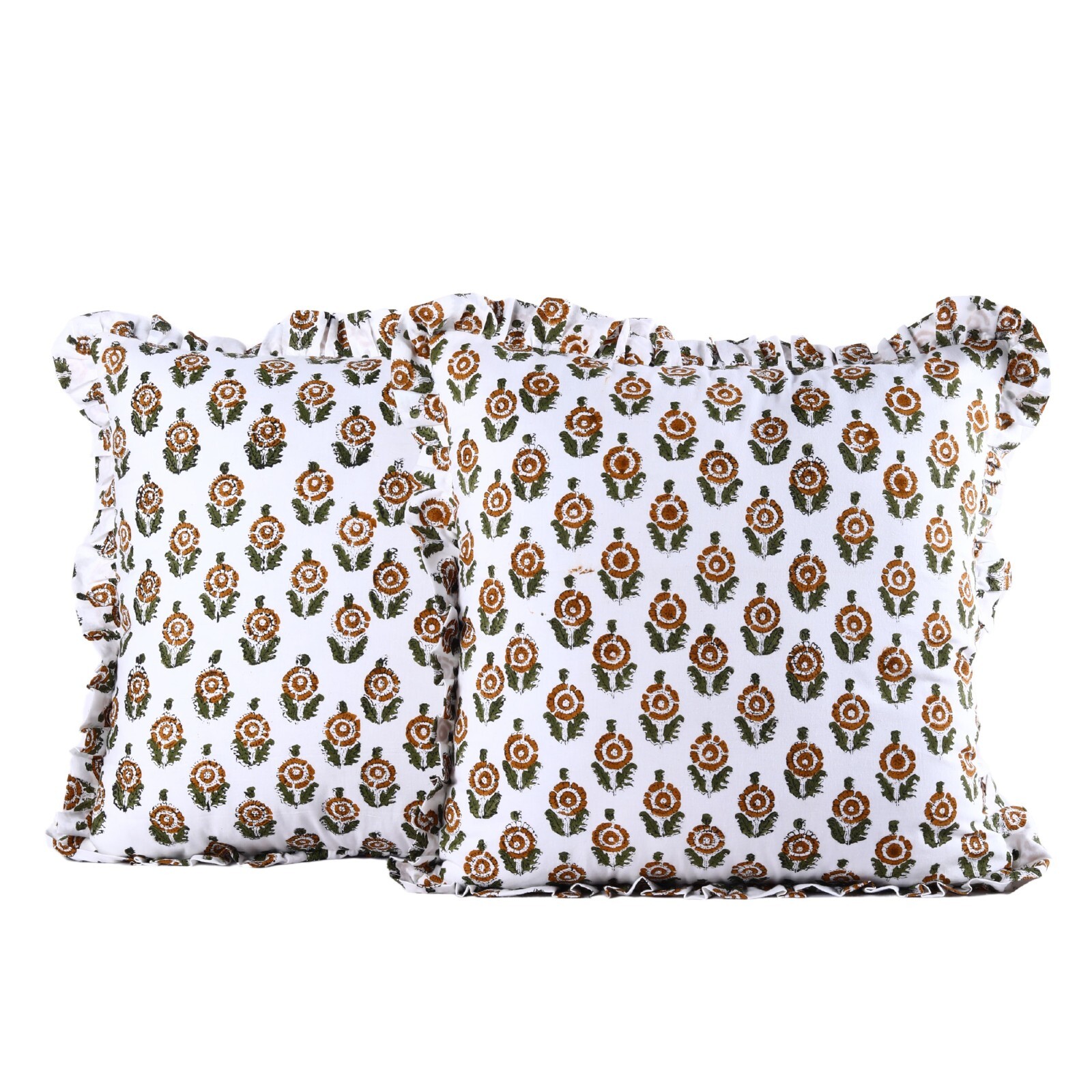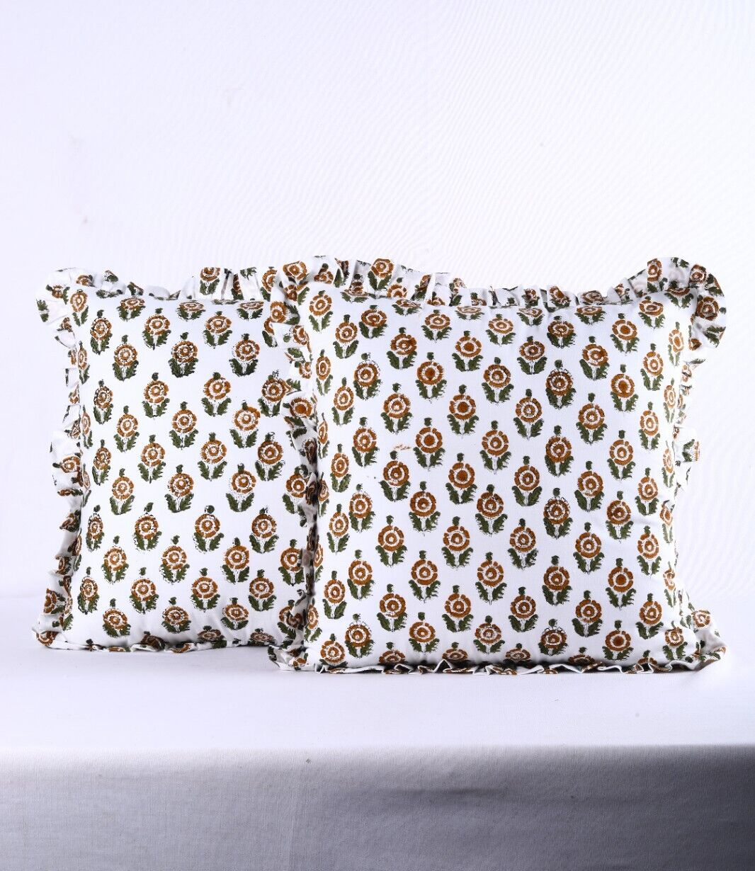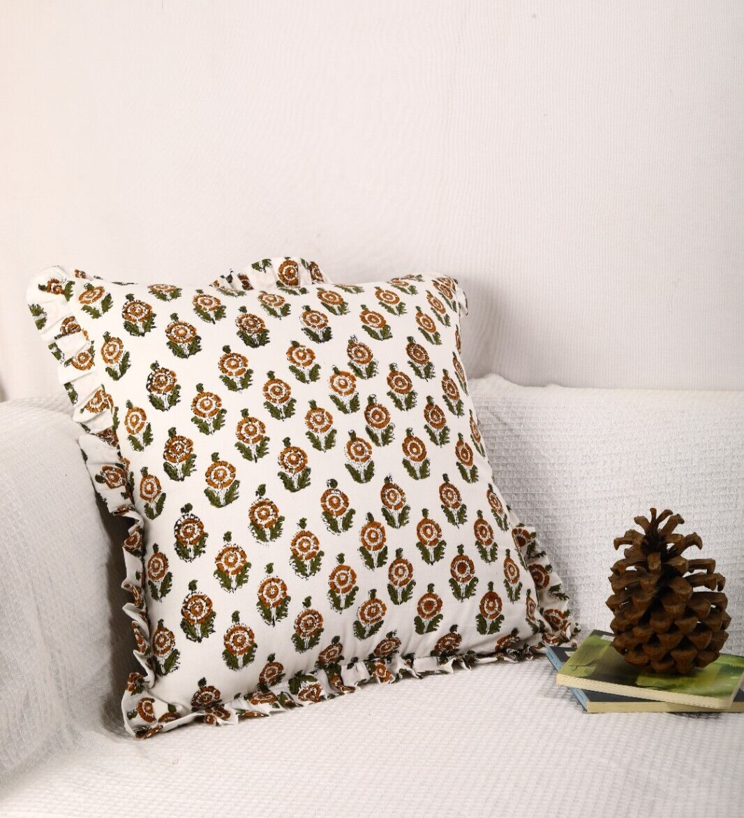Introducing our 18x18 inches Set of 2 Hand Block Print Pillow Cover – a perfect blend of art, comfort, and elegance. Crafted from 100% premium cotton , this cushion cover is not only soft to the touch but also durable, making it ideal for your home or office décor. Key Features: Dimensions: 18x18 inches – the perfect size for your sofa, chair, or bed. Material: 100% Cotton Canvas – offers a smooth, luxurious feel and lasting durability. Technique: Hand Block Printing – each cover features unique, traditional patterns created with meticulous craftsmanship, giving it a one-of-a-kind appearance. Reversible Design: Both sides are adorned with intricate hand block prints, providing two design options in one cushion cover. Ruffled Edge: A delicate, graceful detail that adds a touch of sophistication and elegance. Concealed Zipper: Seamlessly integrated for a neat look and easy cushion removal. Premium Inner Lining: Enhances plumpness and ensures comfort with every use. Versatile Usage: Perfect for any setting – be it your living room sofa, bedroom, office chair, or even as a cozy decorative accent in your study. This pillow cover transcends mere decoration; it’s an artistic statement that enhances your space with its rich, handcrafted charm. Customization Available: We offer customization options to suit your unique preferences, ensuring your cushion cover fits your style perfectly. Note: Actual product color may vary slightly from the photos depending on screen resolution. Elevate your home with the luxury and artistry of this hand block print pillow cover – a piece that brings heritage, craftsmanship, and comfort together in perfect harmony.