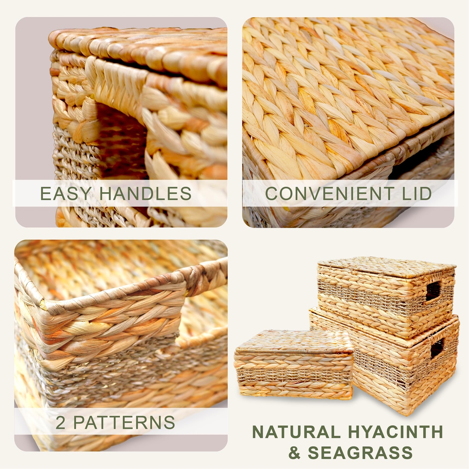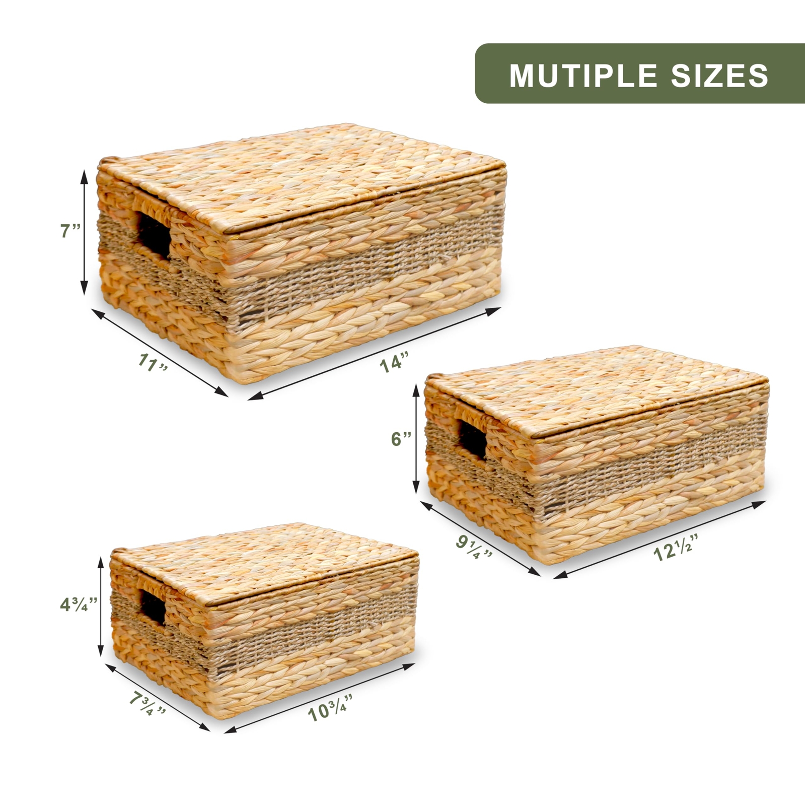 Handcrafted Charm - These water hyacinth basket sets are handwoven, offering a unique, rustic touch to your decor, making each piece a decorative basket with lid, wicker basket with lid, woven storage basket with lid, wicker storage box, rectangle wicker basket, large rectangular basket that's both practical and stylish. Versatile Storage Solution - Keep your home organized with wicker storage baskets with lids, woven baskets for storage with lid, lidded basket, wicker box with lid, woven baskets with lids, hyacinth storage baskets that seamlessly blend functionality with aesthetic appeal, perfect for any room. Durable And Sturdy - Each woven basket with lid, covered baskets with lids for storage, baskets with lids for organizing, large baskets with lids, water hyacinth storage baskets, rectangle baskets for storage is crafted around a robust frame, ensuring they can withstand everyday use while maintaining their shape. Tailored To Taste - Offered in three distinct sizes, these baskets ensure a unified yet flexible storage system that suits any room or requirement. Great used as wicker storage basket with lid, wicker baskets with lids, wicker basket set, storage baskets with lid, rectangular storage basket... Smart Storage - Protect your belongings from dust and maintain neatness with hinged lids that guarantee a secure and tidy closure for each basket. Great used as wicker storage basket with lid large, decorative storage baskets with lids, rectangle wicker storage basket, large rectangle storage basket...