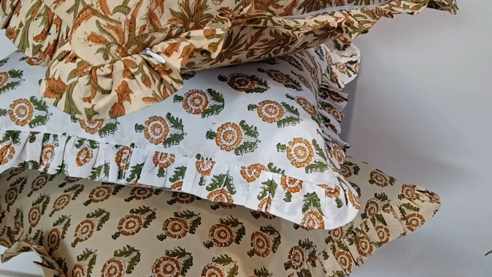 Introducing our 18x18 inches Set of 4 Hand Block Print Pillow Cover – a perfect blend of art, comfort, and elegance. Crafted from 100% premium cotton , this cushion cover is not only soft to the touch but also durable, making it ideal for your home or office décor. Key Features: Dimensions: 18x18 inches – the perfect size for your sofa, chair, or bed. Material: 100% Cotton Canvas – offers a smooth, luxurious feel and lasting durability. Technique: Hand Block Printing – each cover features unique, traditional patterns created with meticulous craftsmanship, giving it a one-of-a-kind appearance. Reversible Design: Both sides are adorned with intricate hand block prints, providing two design options in one cushion cover. Ruffled Edge: A delicate, graceful detail that adds a touch of sophistication and elegance. Concealed Zipper: Seamlessly integrated for a neat look and easy cushion removal. Premium Inner Lining: Enhances plumpness and ensures comfort with every use. Versatile Usage: Perfect for any setting – be it your living room sofa, bedroom, office chair, or even as a cozy decorative accent in your study. This pillow cover transcends mere decoration; it’s an artistic statement that enhances your space with its rich, handcrafted charm. Customization Available: We offer customization options to suit your unique preferences, ensuring your cushion cover fits your style perfectly. Note: Actual product color may vary slightly from the photos depending on screen resolution. Elevate your home with the luxury and artistry of this hand block print pillow cover – a piece that brings heritage, craftsmanship, and comfort together in perfect harmony.