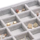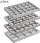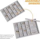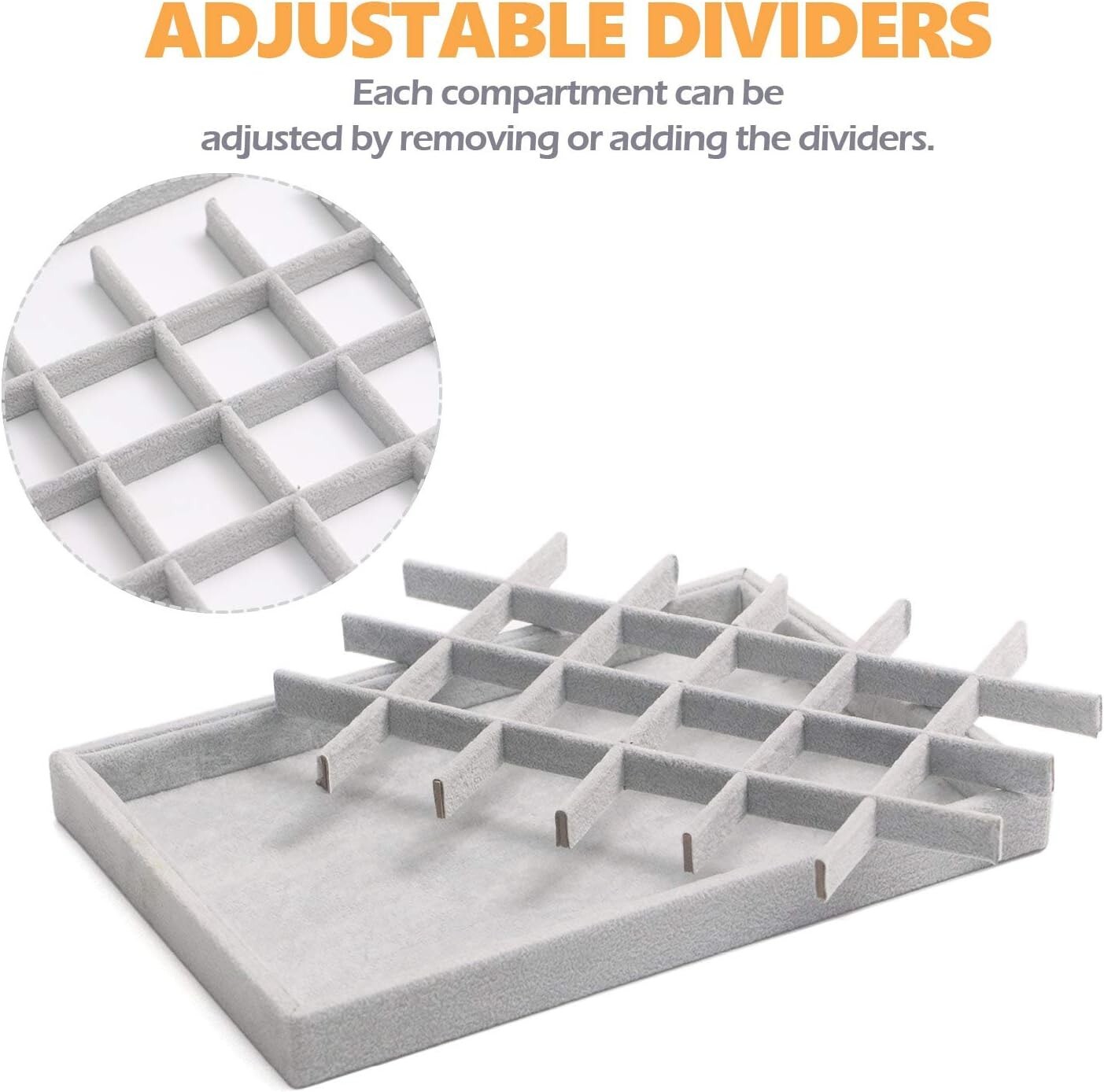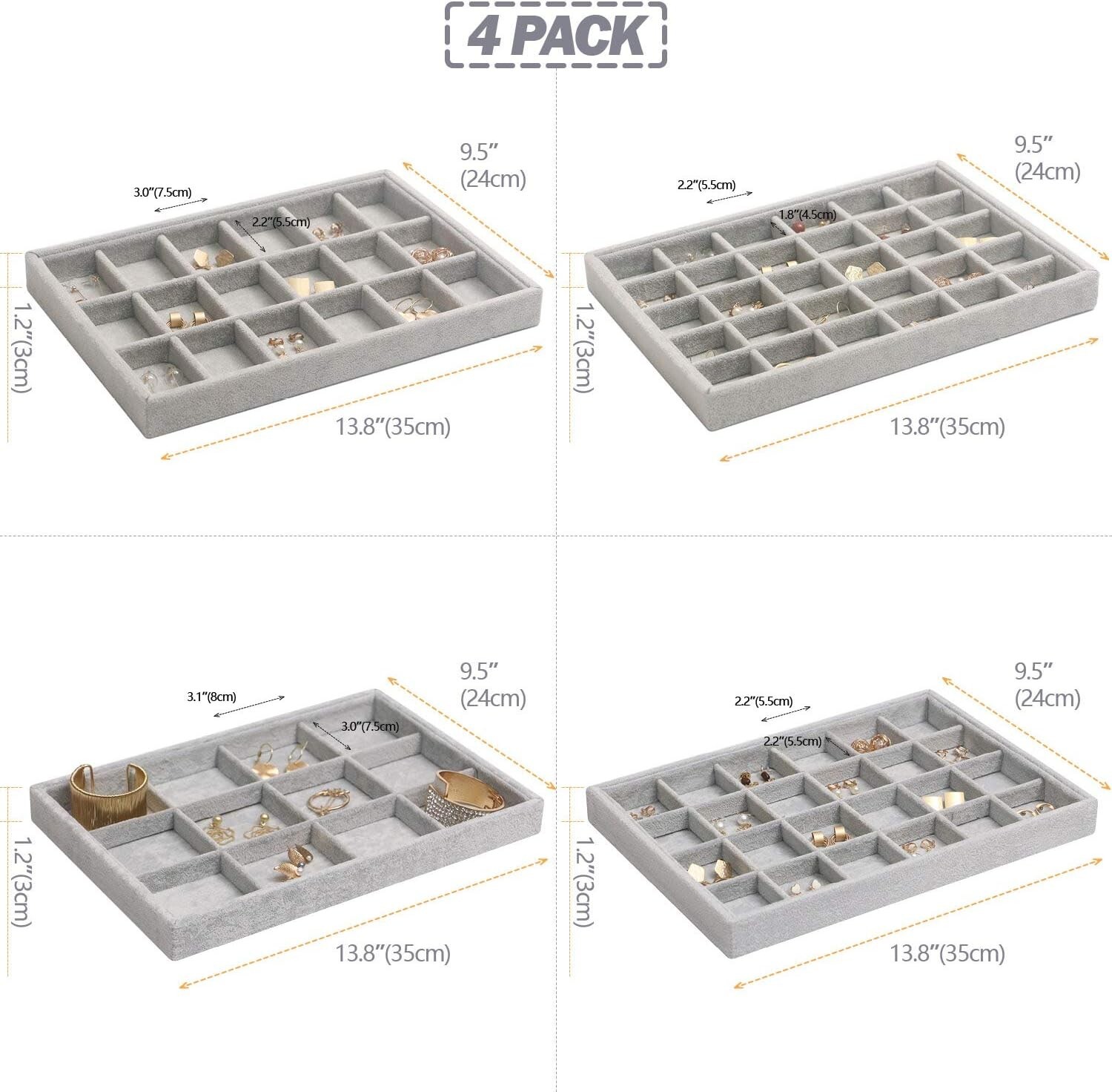 Set of 4 Stackable Velvet Jewelry Trays Organizer, Jewelry Display Storage Box Showcase Holder Dresser Drawer Organizer for Earring Necklace Bracelet Ring Accessary, Grey SET OF 4: Color: Grey. The set includes 30 Compartment Tray(1 Pack), 24 Compartment Tray(1 Pack), 18 Compartment Tray(1 Pack),12 Compartment Tray(1 Pack), Perfect for earrings, rings, bracelets, necklaces. HIGH QUALITY MATERIAL: Made of high-quality velvet and composite boards, the organizer trays are soft to the touch and elegant in appearance, protecting your jewelry from any kind of damage. MULTI-SECTIONAL: Each tray measures " x " x " inch (LxWxH) and is ideal for storing and displaying your jewelry at home or in the store. You can adjust the size and number of compartments by removing or adding the dividers to meet your personalized storage needs. Stylish Stackable design: Easy to stack and separate, easy to place in a dresser or drawer. To match everywhere like living room, dressing table, store and makeup table. Perfect to organize and display your valuable and important jewelry visibly. VERSATILITY: The jewelry display is great for personal use at home, and perfect for a countertop jewelry display in stores or trade shows. They can also be used to store sewing supplies, home accessories, etc. 1, SET OF 4: Color: Grey. The set includes 30 Compartment Tray(1 Pack), 24 Compartment Tray(1 Pack), 18 Compartment Tray(1 Pack),12 Compartment Tray(1 Pack), Perfect for earrings, rings, bracelets, necklaces. 2, HIGH QUALITY MATERIAL: Made of high-quality velvet and composite boards, the organizer trays are soft to the touch and elegant in appearance, protecting your jewelry from any kind of damage. 3, MULTI-SECTIONAL: Each tray measures " x " x " inch (LxWxH) and is ideal for storing and displaying your jewelry at home or in the store. You can adjust the size and number of compartments by removing or adding the dividers to meet your personalized storage needs. 4, Stylish Stackable design: Easy to stack and separate, easy to place in a dresser or drawer. To match everywhere like living room, dressing table, store and makeup table. Perfect to organize and display your valuable and important jewelry visibly. 5, VERSATILITY: The jewelry display is great for personal use at home, and perfect for a countertop jewelry display in stores or trade shows. They can also be used to store sewing supplies, home accessories, etc.