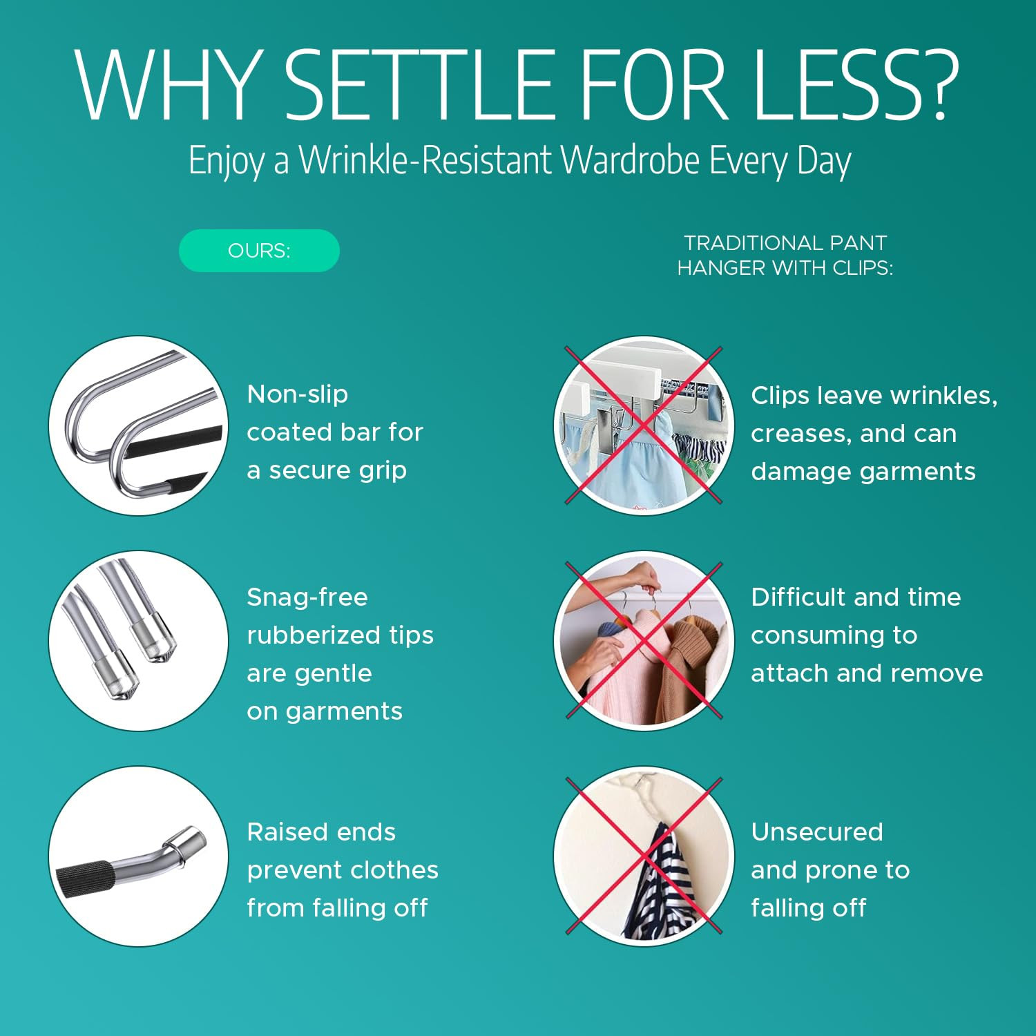 Open Ended Design- The pants and jean hangers for closet feature an open end so you can easily slide your pants and skirts on and off. Rubber Coated Bar- These metal and black pants hangers for women and men are coated with a non-slip rubber to keep your clothing secure, so they won't slip off. Rubber Tips- These hangers for jeans and slacks have rubber tips to prevent your clothing from getting snagged. Built to Last- Our slacks hangers are made of durable metal and are designed as a jean hanger or hangers for trousers. Space-Saving- The slim design will allow you to fit multiple pants hangers for closet. They make perfect men and womens pants hangers as clothes hangers for pants, jeans hanger and hangers for slacks.