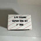 Set of 8 Ceramic Holiday Christmas Holly Napkin Rings are in very good condition, with some minor wear from making but none from use or age as they have been kept in the box and wrapping. Please see Photos for Condition of Napkin Rings. This is a set of 8 holiday Christmas ceramic napkin rings in a white color featuring a holly berry design. The napkin rings are made of porcelain and are in excellent condition, as they have hardly been used. Perfect for adding a festive touch to your holiday table setting, these napkin rings showcase a traditional Christmas theme with their red, green, and white colors, making them ideal for the holiday season.