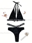 About this item: 2 piece letter tape lingerie set for women Fabric: Fabric is very stretch, and it's soft and comfortable Feature: 2 piece set, letter print, low rise, cheeky panty, womens lingerie, fashionable Occasion: Underwear, nightwear. Suit for wedding night, honeymoon, valentine's day, everyday, etc