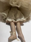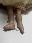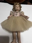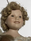 This Shirley Temple doll is signed on the back of the neck J Belle . She is missing one of her shoes. I don’t know how old she is. Her dress looks like it needs cleaned, but her curls are all intact and her teeth are pretty. There’s no tears on her dress and the flowers are all in her hair at her dress looks like it should be cleaned and it is removable .