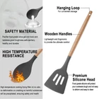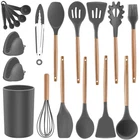 19pcs Organic Silicone Kitchen Utensils: Silicone kitchen utensils set includes 12pcs cooking tools that will suit all your cooking and baking needs. Our silicone kitchen utensil set includes: Tong, Whisk, Basting Brush, Slotted Spoon, Slotted Turner, Pasta Server, Spoon, Spatula, Round Spatula, Solid Turner, Soup Ladle. Also come with the gift of 5pcs small Measuring Spoons of different sizes black color and 2pcs Silicone Mini Gloves. Heat-resistant & Non-stick & Non-: Our silicone kitchen utensils set use food silicone which are super up to 464°F/240°C.The high heat tolerance of the silicone heads prevents the utensil from melting when exposed to heat. Kitchen utensils are also non-stick and non-,easy to use and . Only the basting brush silicone head and wooden handle are designed to be detachable, it can be put back at any time without affecting the use and easy to clean. Safe Cooking Utensils for Kitchen: All kitchen tools are made of high quality thermoplastic silicone heads designed to protect the surface of precious non-stick cookware. silicone is safe to use for any type of food .The kitchen utensil set does not react with food or beverages, or produce any hazardous fumes. Solid Wooden Handle to Prevent Burns: This cooking utensils set combination of silicone head and wooden handle, the wooden cookware handle is ergonomically designed for comfortable grip, does not transfer heat to protect your hands and provide protection against rust. Easy Storage with Holder: Our silicone kitchen utensils set comes with a plastic holder for convenient storage organization. Each wooden handle has a practical hanging hole for wall hanging using hooks. Provide Customer Support: silicone kitchen utensils set for cooking with holder are under strict quality standards so you can use it with confidence. If you are not completely satisfied for any reason, please feel free to us via , we will reply you as soon as possible within 12 hours.