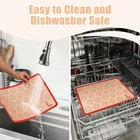 Thicker Design for Macaron Cookie Baking Mats: The bigger red nonstick silicone macaroons baking sheet are in 16.5x11.6 inch .The small red liner is 11.8x8.3inch. The silicone mat thickness is 0.75 mm design. It is much durable and long lasting. Non Stick and Easy to Clean: These silicon mats are made from food liquid silicone with fiber glass, so you will enjoy the non-stick baking mat if you buy them now. No more scrubbing! Even burnt sugar and fat falls off on its on. Just rinse the washable and reusable mat in warm soapy water to clean it and dishwasher safe. Safety and Food Liquid Silicone: These macaron baking liners made from liquid silicone material are more clear and soft. The liquid silicone doesn’t include the vulcanizing agent and also can use for kitchen products. The solid silicone is dark and include the vulcanizing agent. The silicone mat is made of food silicone. Versatility: Oven/Microwave/Dishwasher/Freezer Safe: Macaron mat is made from highest food liquid silicone and can be used at temperature ranging from -40°F to 485°F (-40 to 251°C). Perfect for baking, candy/macaron/pastry/cookie/bun/bread. Also for table/placement mats. As a Present:This premium macaron baking mat is durable and healthy .There are an instruction and hair elastic as a present..This premium silicone macaroon mat with giftbox and hairtie is perfect to give as a present.