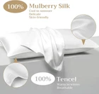 About this item Dual Sided Pillowcases: Pillow cases features 2 kinds of materials: A side is 100% Pure Mulberry Silk, B side is 100% organic Wood Pulp Fiber.Silk pillowcase side let you feel in cool space,wood pulp fiber pillowcase side let you feel warm while keeping your dreaming deep and sweet. Hidden Zipper & Built-in Drying Rope: Our silk pillow slip with the well-known YKK hidden zipper is good for 200 times more durable than ordinary zippers';prevents your silk pillowcae from moving out when you sleep;makes it easy to install pillow insert.Built-in drying rope makes pillowcase drying more convenient. Upgraded Workmanship: We upgrade the process to 5 stitches/0.4in,pillowcase is more durable and tough than most silk pillowcases are thin cause they use the 3.5 stitches/0.4in process.No worrying about the pillow covers tearing now.Reactive printing and dyeing processing,silk pillowcase 2 pack will not fade. Silk Pillowcase for Hair & Skin: The silk pillowcase doesn't absorb the serum applied on your face,leaving the skin fully moisturized.Mulberry silk pillow protector case contains 18 kinds of amino acids, including serine,which can nourish the skin and slow down the aging process. Best Gift for Ladies: Pillowcase set of 2 available in 3 sizes and 6 color solutions.Using our pillowcases to sleep, no static electricity,no hair mess,keep you looking beautiful.They fit your friends who want to improve the condition of their skin or hair and love sweet sleepers.Beautifully packaged in our carefully designed red gift box,the pillowcases for woman are definitely a refined and thoughtful gift. Product Description This white silk pillowcase set of 2 for you has a high density of 22 momme. We choose 6A grade silk fabric. This cozy and luxury silk pillowcase 2 pack cares your healthy and comfortable life. 100% mulberry silk and 100% natural wood pulp fabric combine the anti-allergic properties of silk and the durable comfort of tencel with the silky feel of satin silk. Our pillowcases can meet the sleeping needs of the whole family and take good care of your family for a long-time use. Experiencing two sleeping feelings and longer usage by our dual-side natural silk pillow covers. The materials are natural and real, and the pillowcase is thickened and encrypted, which is more durable and tough. Silk pillowcase with zipper and hidden & careful closed stitches make it look tidy. You can choose from variety colors and three sizes of this 2 pack silk pillowcase.