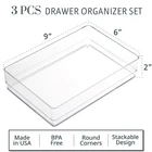 Crafted in the USA from premium, durable BPA-free clear plastic, our drawer organizers prioritize both quality and environmental responsibility. By choosing domestically made products, you're reducing carbon emissions from production to delivery compared to products produced overseas. Experience unparalleled versatility with our stackable design, perfectly suited for a myriad of items including cosmetics, jewelry, kitchen utensils, and office supplies. Say goodbye to cluttered spaces and hello to streamlined organization as these trays effortlessly maximize every inch of available space, transforming even the most chaotic drawers into orderly spaces. Take control of your storage solutions with ease by customizing your layout to suit your unique needs. Whether it's in the bathroom, dresser, vanity, or desk, our organizers seamlessly adapt to any environment, providing tailored organization wherever you need it most. Our drawer organizers not only help them keep their new home tidy and clutter-free but also add a touch of elegance to any space. It's the gift that keeps on giving, day after day. Give as a housewarming present for a new home or add to a wedding registry. This comprehensive set includes three meticulously crafted 9-inch by 6-inch shallow drawer organizers, designed to accommodate your essentials with precision. And with additional sizes available, you have the freedom to expand your organizational arsenal to tackle any cluttered drawer with finesse.