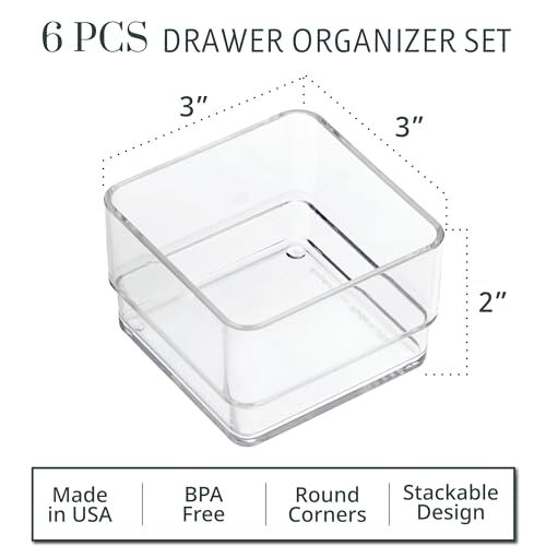 Return Policy Fast Delivery Trusted seller SimpleSort 6-Piece Stackable Clear Drawer Organizer Set | 3" x 3" x 2" Square Trays | Small Makeup Vanity Storage Bins and Office Desk Drawer Dividers | Made in USA Product Description Crafted in the USA from premium, durable BPA-free clear plastic, our drawer organizers prioritize both quality and environmental responsibility. By choosing domestically made products, you're reducing carbon emissions from production to delivery compared to products produced overseas. Experience unparalleled versatility with our stackable design, perfectly suited for a myriad of items including cosmetics, jewelry, kitchen utensils, and office supplies. Say goodbye to cluttered spaces and hello to streamlined organization as these trays effortlessly maximize every inch of available space, transforming even the most chaotic drawers into orderly spaces. Take control of your storage solutions with ease by customizing your layout to suit your unique needs. Whether it's in the bathroom, dresser, vanity, or desk, our organizers seamlessly adapt to any environment, providing tailored organization wver you need it most. Our drawer organizers not only help them keep their new home tidy and clutter-free but also add a touch of elegance to any space. It's the gift that keeps on giving, day after day. Give as a housewarming present for a new home or add to a wedding registry. This comprehensive set includes six meticulously crafted 3-inch by 3-inch shallow drawer organizers, designed to accommodate your essentials with precision. And with additional sizes available, you have the freedom to expand your organizational arsenal to tackle any cluttered drawer with finesse. Shipping Returns Payment Shipping Shipping is FREE to all addresses other than APO/PO boxes in the lower 48 states. All our stock ships from US-based warehouses. Shipped via USPS or UPS (depending on location and package weight) Unless stated otherwise, all orders will ship within 24-72 hours of your payment being processed. Check our feedback to see the great reviews of FAST shipping we offer. Returns Seller does not accept returns Payment We currently accept payment via eBay managed payments only. Once payment is cleared, we will dispatch your shipment within 1-3 business days. Please refer to the "Shipping" tab for more information regarding shipping speed to your destination.