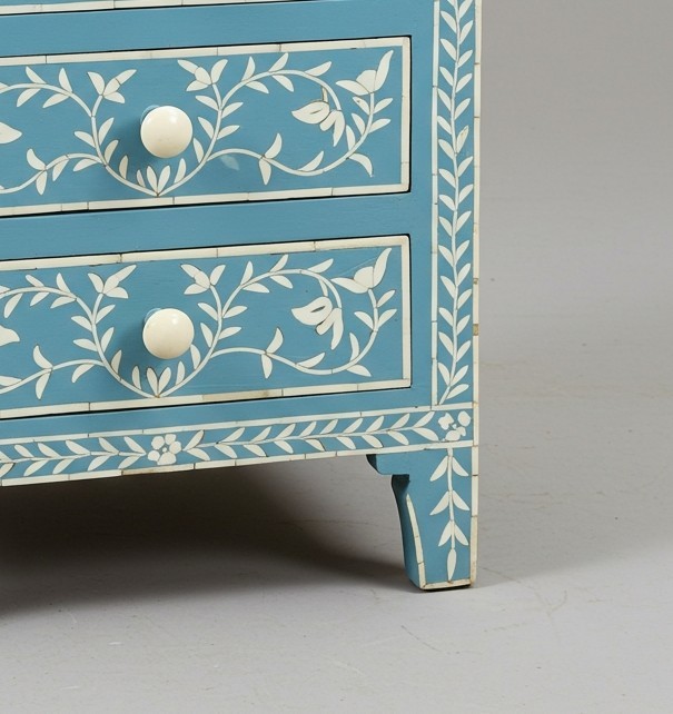 Bring freshness and artisan charm to your space with this handcrafted Sky Blue Bone Inlay Bedside Table, featuring a delicate floral vine pattern and three functional drawers. Handmade by expert artisans in Rajasthan, India, this piece reflects generations of traditional craftsmanship, brought to life in a soft, refreshing sky blue palette. Each design element is hand-carved from ethically sourced camel bone and individually inlaid to form graceful flowers and trailing vines. The soothing sky blue resin creates a breezy, coastal-inspired backdrop for the inlay, while bone knobs on each drawer complete the look with a clean and harmonious touch. With three drawers offering practical storage, this piece works beautifully as a nightstand, side table, or decorative accent cabinet. Its cool tones and intricate design make it a perfect fit for light, airy interiors—whether coastal, bohemian, or feminine chic. Every piece is handmade, and minor variations in tone and inlay placement highlight the unique nature of your table, making it truly one of a kind. Product Specifications: Material: Bone Inlay, Solid Wood, Resin Pattern: Hand-Inlaid Floral Vine Motif Color: Sky Blue Base with White Bone Inlay Drawers: 3 Drawers with Coordinated Bone Knobs Finish: Matte Smooth Finish Style: Coastal Bohemian, Ethnic Luxe, Soft Artisan Origin: Handmade in Rajasthan, India Care Instructions: Wipe clean with soft cloth; avoid abrasive materials Assembly: No assembly required