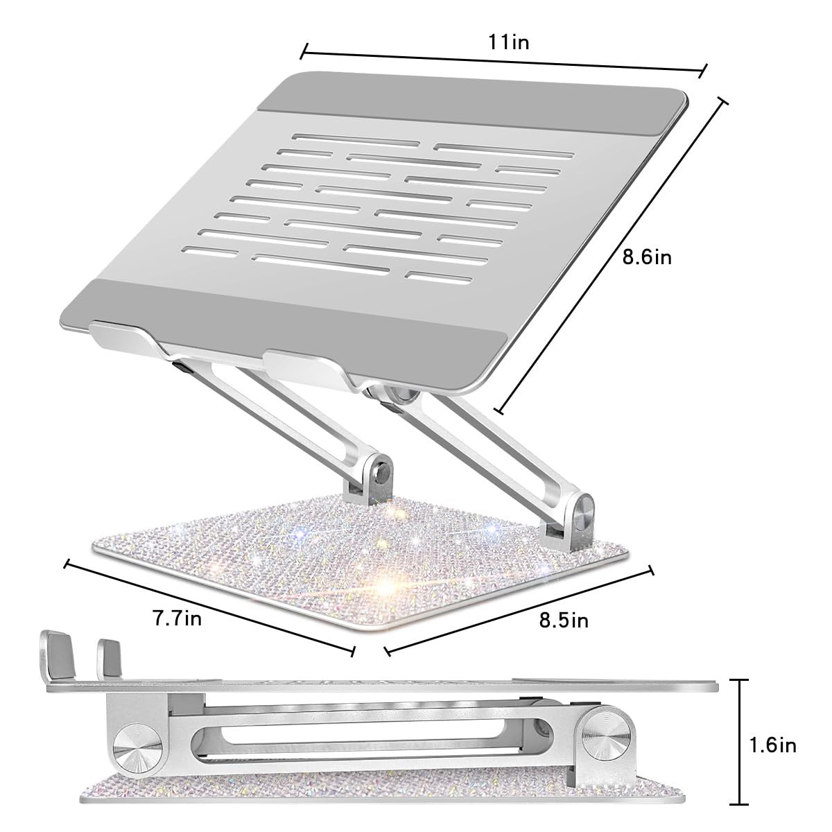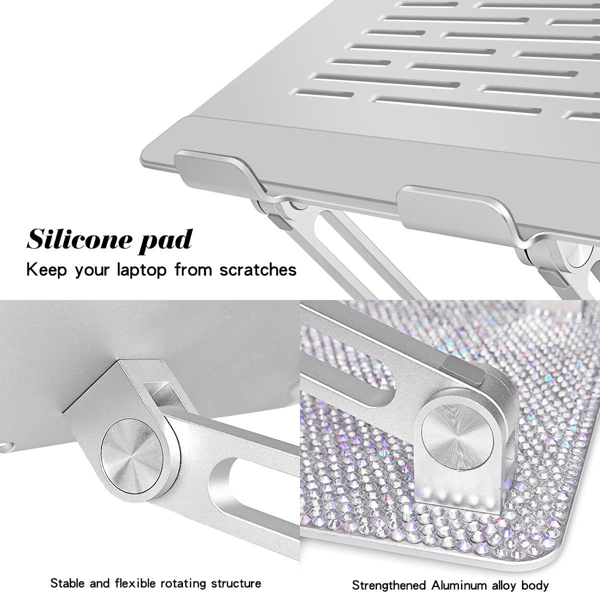 Bling Adjustable Laptop Stand, Portable Laptop Riser, Aluminum Laptop Stand for Desk Foldable, Ergonomic Computer Notebook Stand Holder for MacBook Air Pro, Dell XPS, HP (10-17.3'') - Silver ๐๐๐Wide Compatibility: The bling laptop stand is compatible with all laptops, from 10 "to 17.3", including popular models such as MacBook, MacBook Air, MacBook Pro, Surface laptop, Dell, Google, HP, Asus, Acer, Chromebook, Laptop, Laptop, Laptop, Laptop, Laptop, Laptop, Laptop, Laptop. Alienware, etc. ๐๐๐Shiny Design: The base of laptop riser is fully covered with more than 3000 sparkling glass rhinestones, Mosaic process: neat, delicate, solid, each rhinestone has 16 reflecting surfaces, the overall effect is very luxurious, adding vivid feeling to your boring work desktop, so that you can add more inspiration in the work. ๐๐๐Adjustable and Portable Design: The glitter laptop stand can be easily adjusted and fixed to a comfortable height and Angle according to your actual needs, reducing your neck, shoulders and spine fatigue and allowing you to operate and type with ease. In addition, you can fold up the laptop stand and store it in your laptop bag to take with you when traveling and on business trips. ๐๐๐Upgrade the Large Base: made of high-quality aluminum alloy, does not fade or rust, and the larger and heavier base greatly improves the stability of the entire support. When you type on the laptop, the laptop stand is very stable, it will never vibrate or slide. ๐๐๐The perfect Detail: Large ventilation holes provide better ventilation to cool your laptop and prevent the laptop from overheating and freezing. Non-slip silicone prevents the laptop from sliding and dropping on it, and the smooth edges can protect your laptop from scratches. This luxurious shiny laptop stand can also be a gift for your best colleagues and friends and won't go unnoticed.