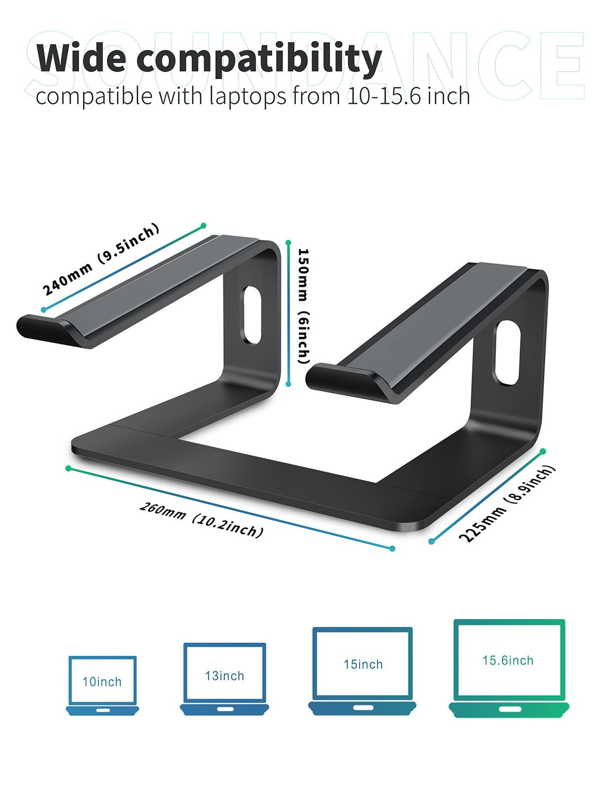Suit for any laptop 10 to 15.6 inches - The laptop stand fits all laptops 10 to 15.6 inches, such as notebooks PC computers 10 inches, 11 inches, 12 inches, 13 inches, 13.3 inches, 14 inches, 15 inches, 15.4 inches, 15.6 inches, etc. (NOT SUIT FOR 15"-17.3" Surfacebook) Sturdy and portable - The office computer stand is totally made of thickened aluminum alloy, so the stand is sturdier and has less wobbly. The rubber on the holder hands sticks tightly and ensure your laptop stable on the stand. And the rubber feet prevent the stand from slipping on your desktop. Moreover, the stand is detachable and easy to install without tools, so the lightweight laptop stand is really portable. Ergonomic design - The slim compact stand elevates your laptop by 6-inch to a perfect eye level and prevents you from hunching over your screen, which reduces neck and shoulder pain. Moreover, the edge of the stand is so smooth that protects you from being scratched. Cooling better and keep desktop organized - The ventilated elevator desk stand only has two holder hands but not a whole flat, so there is more space to enable the heat to vent and keep your notebook computer from overheating. Also, you can organize your office items such as keyboard and mouse under the thin stand. Detachable and simple installation - The laptop stand can be conveniently disassembled into 3 parts. And You can easily reassemble it again easily.