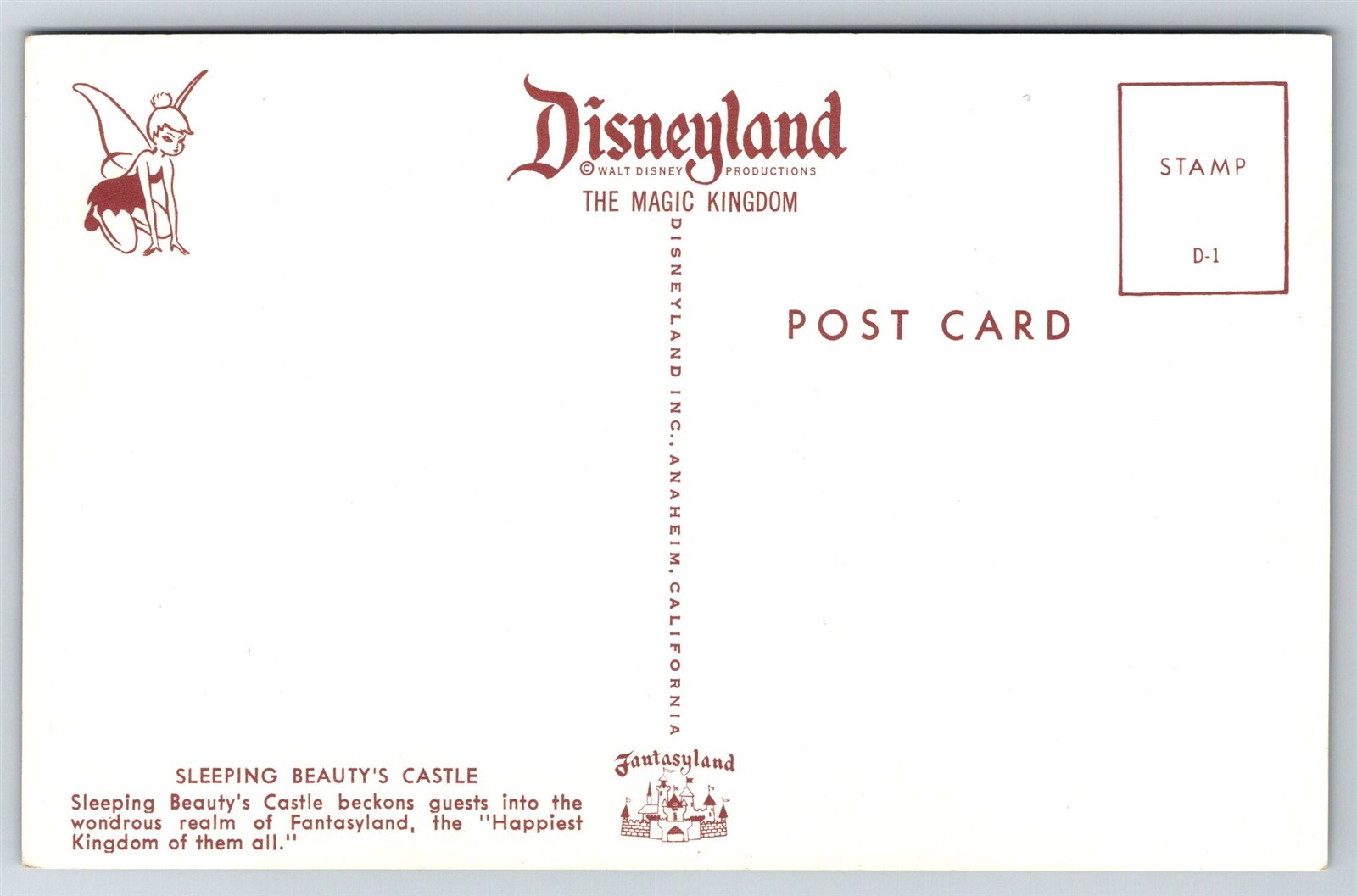 Sleeping Beauty's Castle Disneyland The Happiest Kingdom Anaheim CA Postcard Y3 Thank you for visiting! This is a standard size postcard, 3.5" X 5.5". In stock, usually ships within 24 hours of your purchase. Please ask questions if you are unsure about anything. Our goal is for your complete satisfaction with the postcard and your experience. Check all my other listings in my store. RETIREDWITHBOOKS Powered by SixBit's eCommerce Solution