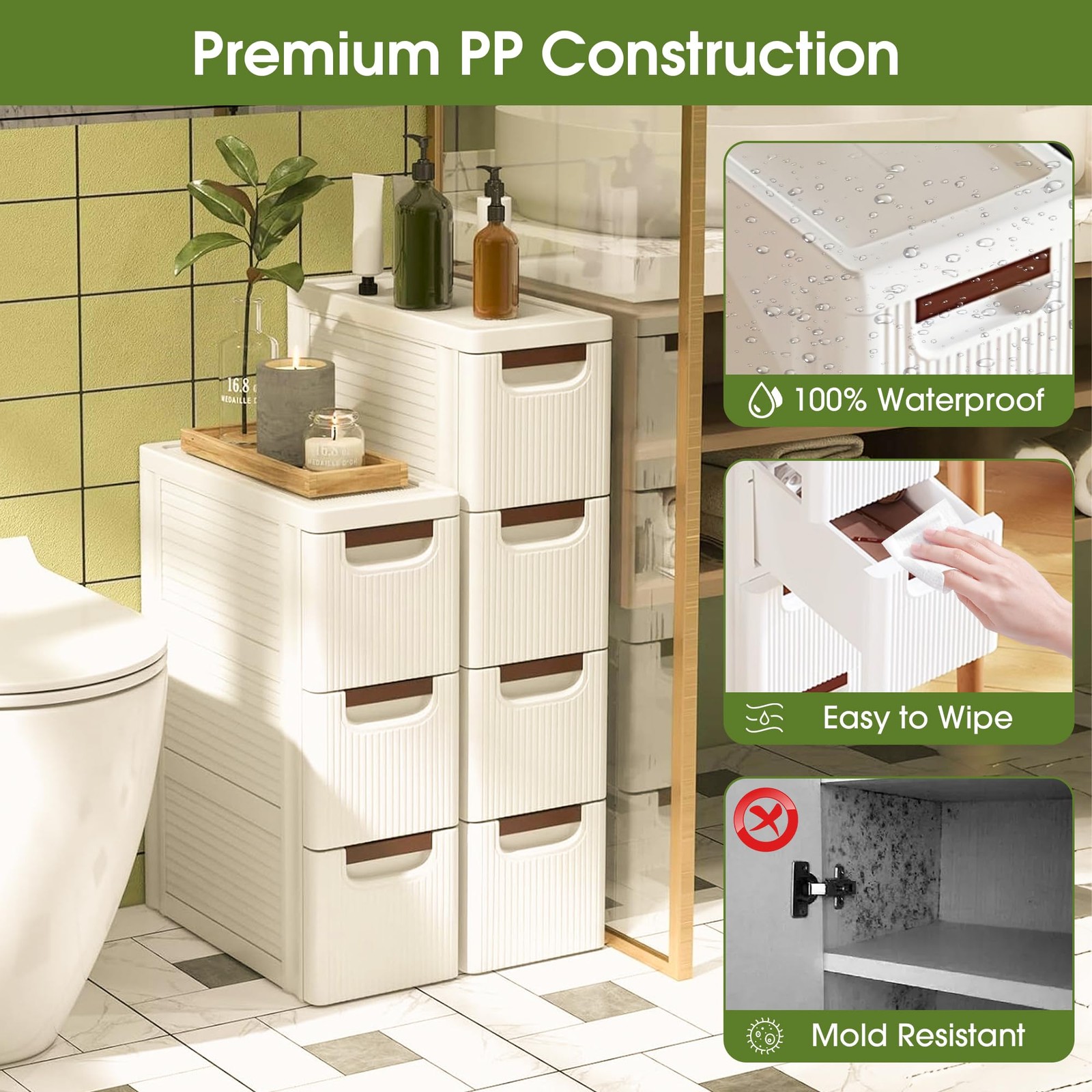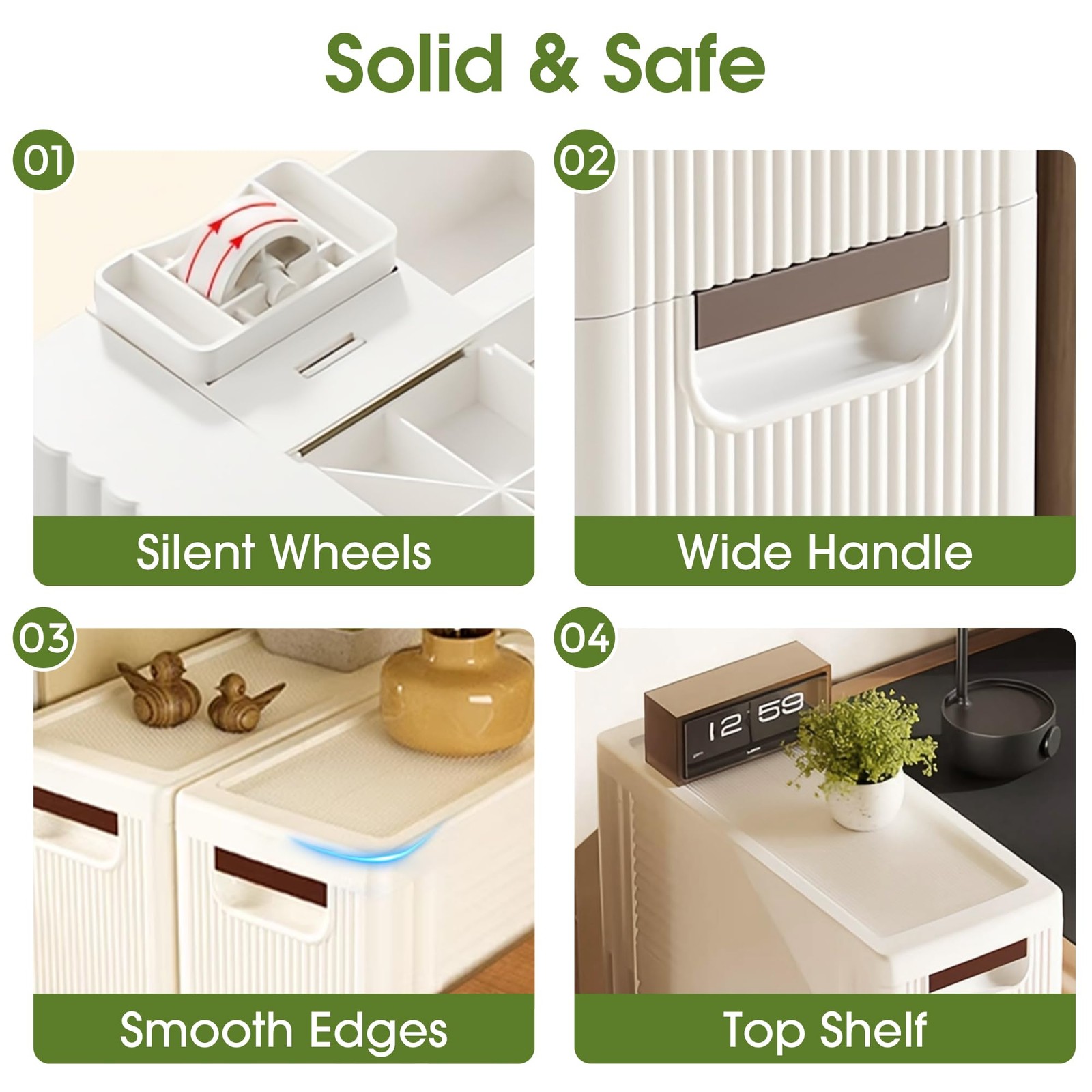 Narrow Storage Cabinet for Home [Compact & Space-Efficient] Designed to fit in corners and tight spaces, this storage cabinet optimizes your area with its dimensions of 16.5 inches long and 7.5 inches wide (42cm x 19cm), making it ideal for kitchens, bathrooms, and living rooms. [Versatile & Spacious] This slim storage cabinet features multiple drawers, offering ample storage for various items to keep your space organized. Its elegant design complements any room style, serving as a bathroom cabinet, kitchen storage, or living room side cabinet for essentials like towels, cosmetics, and toiletries. [Robust & Safe] Crafted from high-quality PP material, this narrow storage cabinet boasts exceptional sturdiness and load-bearing capacity, ensuring stability without tilting or deformation. The smooth, rounded edges enhance safety for children and the elderly. [Water-Resistant & Low Maintenance] Unlike wooden cabinets, this plastic narrow storage cabinet variant is perfect for humid environments. Its superior sealing protects against water and dust, while the smooth surface allows for easy cleaning with a damp cloth. [Simple Assembly & Mobility] The storage cabinet comes with a comprehensive English manual for effortless assembly—no tools required, and it can be set up in minutes. Silent wheels facilitate easy movement for cleaning while protecting your floors from scratches.