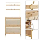 Shoe Cabinet for Entryway Living Room, Flip Door Shoe Cabinet 70x24x152cm Description Are you still struggling with shoe storage? Then please take a look at our product. Our shoe cabinet is an efficient organizing solution designed for the home. It combines a rational spatial layout with a practical design, aiming to provide a storage space for your shoes that is both aesthetically pleasing and functional. Whether it's sneakers, casual shoes, or boots, it organizes them all neatly. Key Features Made to Last: High-class bamboo, ABS, and MDF with an exquisite spray painting process make this product sturdy, scratch-resistant , impact-resistant , and not easy to corrode and deform, ensuring a long service life. Large Storage Capacity: The product features a two-tier design with double storage space on each tier for more shoe storage. Whether it's your daily wear or seasonal shoes, they can be arranged in an orderly manner to meet the diverse needs of family members. The bottom area can also store shoes. User-friendly Design: This product adopts a flip door design, making it easy to open and close. It is not only effective in preventing puppies from chewing on your shoes, but it also prevents dust from entering the shoe cabinet. The shaft is sturdy and durable, with a cushioning design to ensure low noise. Thoughtful Design: The 8 hooks allow you to hang headphones, bags, hats, and other items, providing you with additional storage space. Good Ventilation: The mesh ABS breathable cabinet doors enhance air circulation and effectively prevent mold and odors from growing inside. Stable Structure: The product is equipped with an anti-tip fixture that attaches it to the wall, making its structure more stable and preventing it from tipping over. Up to 16.53 lbs load-bearing capacity of the top countertop allows you to place potted plants, small speakers, bags, and other items, providing you with extra storage space. High Adaptability: The divider in the middle of each tier can be removed, thus allowing you to place shoes of different heights. Space Saving: The vertically slim structure allows you to place it behind the door or in a corner, saving space. Enjoying Tidiness: It cleverly integrates shoe storage into life, placing it at the doorway to store your messy shoes, making it pleasing to the eyes as soon as you open the door, bringing you an organized lifestyle. Details Practical Handles : The handles on the cabinet doors make it easy for you to open and close the doors and get your shoes. Reserve Skirting : This design allows the cabinet to be placed close to the wall, thus saving space. Raised Cabinet Feet: The 5.9-inch raised cabinet feet are designed to make it easy for you to change shoes, and it is convenient for you to clean the floor. Application It is suitable for living rooms, entrances, terraces, or bedrooms, and can be used to store slippers, casual shoes, high heels, leather shoes, boots, and other shoes, as well as some daily necessities such as keys, bags, scarves, alarms, etc. How to Fix without Punching Tear off the protective film of the traceless sticker. Stick a large traceless sticker on the surface that fits the wall, and a small traceless sticker on the surface that fits the cabinet. Fix the fixture onto the shoe cabinet. Press the shoe cabinet onto the wall and secure it. How to Fix by Drilling Holes The shoe cabinet holes are aligned with the wall and marked with holes. Drill holes at the marked positions. Screw in the screws to secure the shoe cabinet to the wall. Specification Material: Bamboo, ABS, MDF Color: Wood Color Process: Spray Painting Style: Modern Assembly Required: Yes Mounting Type: Free Standing Number of Tiers: 2 Overall Product Size: 70*24*152cm/27.5*9.4*59.84in Cabinet Height: 87cm/34.25in Hanging Rack Height: 67cm/26.38in Tier Spacing: 34cm/13.4in Feet Height: 15cm/5.9in Countertop Load Capacity: About 7.5kg/16.53lbs Package Size: 93.5*34.5*10.5cm/36.81*13.58*4.13in Gross Weight: 8.4kg/18.52lbs Net Weight: 7.98kg/ 17.59lbs Package Included 1* Shoe Cabinet Other Accessories for Assembly Notes Please avoid soaking in water or in a humid environment for a long time. Please do not let children climb to avoid accidents. The traceless sticker is suitable for flat and smooth ceramic tile surfaces, wooden walls, smooth walls, and walls that do not shed dust or peel. Please note that the quantity of shoes stored depends on the style and size of the shoes. Please clean regularly and wipe with a soft damp cloth (not included). Please note that shoes, flower pots, and other items are not included. Please allow the slight color difference caused by the shooting light and 1-3cm error due to manual measurement, and make sure you do not mind before ordering. Payment Delivery details Terms of sales About us Contact us Payment We accept ebay payment 。 Fees such as import duties, taxes are not included in the item price or shipping costs. These charges are the buyer's responsibility. Delivery details Shipping: 2-9 working days to: USA Terms of sales We maintain high standards of excellence and strive for hundred percent customer satisfaction. Feedback is very important to us. We hope that you contact us immediately before you give neutral or negative feedback, so that we can address your concerns. It is impossible to address issues if we do not know about them! About us Your satis faction is our ultimate goal. We work hard to earn your trust and future business. Our certified technicians have tested each item before shipping. The unit comes with 1 year limited warranty on all manufacturing defects. a) If you receive a defective item, you may return it or ask for a discount. Please contact us within 14 days after you receive the package. b) What you returned must be intact and in its original packaging as re? u. Customer is responsible for shipping costs of the returned item. c) We will cover the cost of shipping back t with the shipping rate indicated in the registr