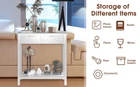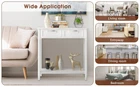 Entryway Narrow Console Wooden Table With Storage Drawers & Open Organizer Shelf ● Narrow Console Table with Storage: The 31.5"L x 14"W x 32"H console table fits limited room yet to bring ample storage space. It features a spacious tabletop, 2 pull-out drawers and a bottom storage shelf to meet storage or display needs. ● Sturdy Construction with Solid Wood Legs: Crafted with premium MDF panels and solid rubber wood legs, the entryway table has a strong bearing capacity and long lifespan. Plus, the adjustable foot pads further improve overall stability. ● Anti-tipping Device for Extra Security: Worried about mischievous kids or furry friends? Get relaxed! This accent table comes with anti-tipping device to prevent falling accidents. And the drawers are also equipped with stoppers to avoid sliding off. ● Elegant and Versatile Addition: The sofa table looks stylish and elegant. It comes to elevate your room decoration to the next level. Besides, with practicable functions, the table can serve well in entryway, living room, dining room, etc. ● Pre-installed Design for Quick Assembly: The foyer table comes partly pre-installed, leaving you some simple steps to finish assembly. Plus, the detailed instruction and labeled accessories will also be of great help. Color: White Material: MDF, Rubber Wood Overall Dimensions: 31.5" x 14" x 32" (L x W x H) Bottom Shelf Dimensions: 27.5" x 12" x 19" (L x W x H) Clearance Between Bottom Shelf and Ground: 4" Interior Dimensions of Drawer: 11"x 10" x 4" (L x W x H) Front Panel of Drawer: 12"x 4.5" (L x W) Weight Capacity of Tabletop: 110 lbs Weight Capacity of Bottom Shelf: 44 lbs Net Weight: 25 lbs