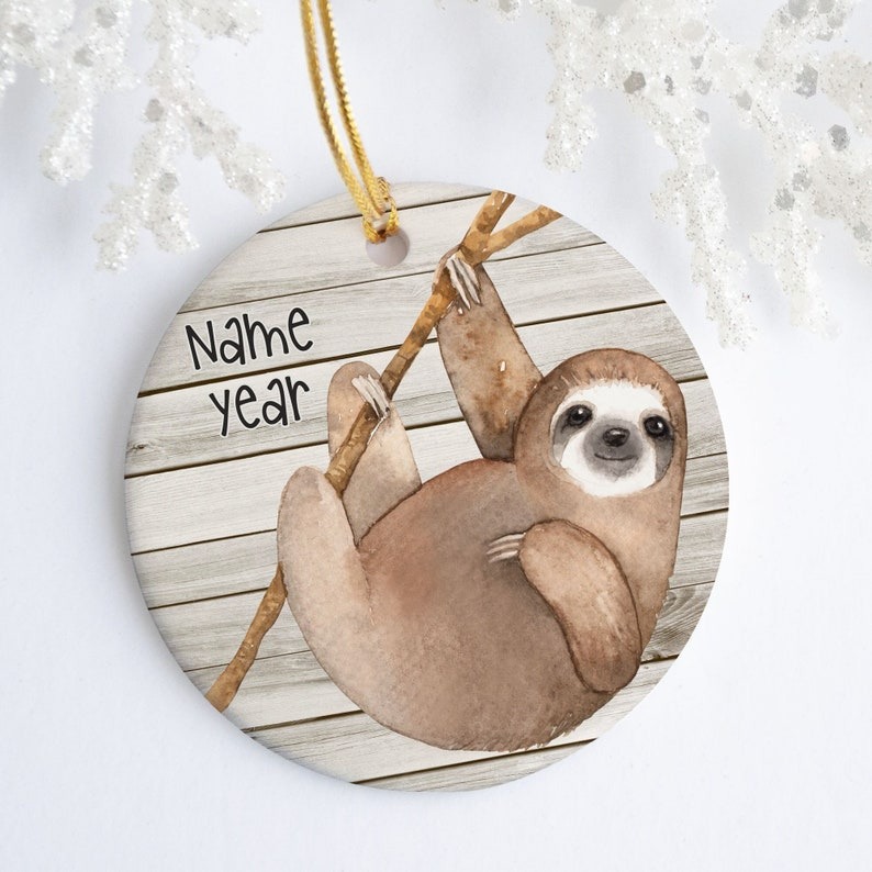 Sloth Ornament - Personalized Ceramic Ornament - Name Date - Porcelain - Holiday Decorations - Custom - Jungle Animals - Ornament For Kids If you need to buy more, please inbox us We have two material options (Ceramic & MDF), please read the product description as below to choose your favorite options. MDF Ornaments 1-sided design. Print type: Sublimation printing. Crafted from durable MDF with a high-gloss plastic finish so your designs last a lifetime. Shapes: Round, star, heart and oval . Product Dimensions: Circle & Heart, 2.75” tall; Oval & Star, 3.25” tall. Ships with a festive gold cord for easy hanging. CERAMIC Ornaments 125" (3mm), 2.75" height (circle), thick high-quality porcelain One-sided print Hole for the hanging string Gold-toned string included Available in 4 shapes - Snowflake, Star, Heart and Circle The height of the hole can slightly deviate Shipping, Return and Refund Policy On average, merchandise is produced and shipped from our facility 2-4 business days after purchase. Standard Shipping: 5-7 working days for USA. Please contact us if you have any dissatisfaction with the item you buy so that we give you the solution. It is easier for us to handle your issue if you send us the proof like an image. We can replace another within 30 days without fee if the item is defective, damaged, or an error is made on our end.