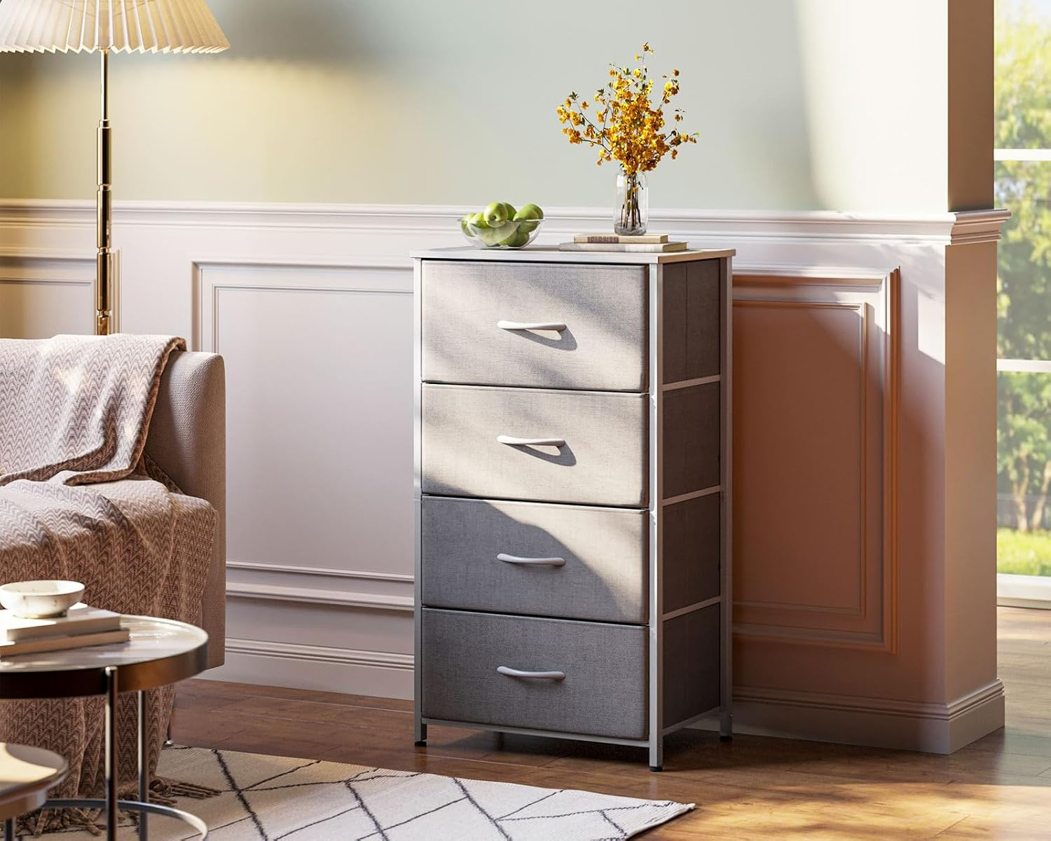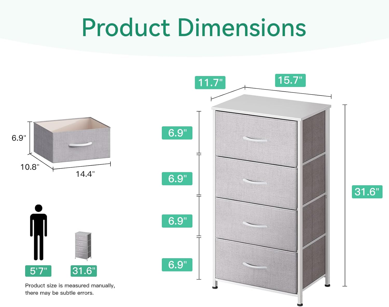 Store New Arrivals Add to Favorite View Feedback Contact Dresser for Bedroom with 4 Storage Drawers, Small Dressers Chest of Drawers Fabric Dresser with Sturdy Steel Frame, Dressers for Closet with Wood Top, Light Grey Description Item model number 4-Drawer Dresser Material Wood, Alloy Steel Finish Type Polished Room Type Bedroom, Living Room, Hallway Assembly Required Yes Mounting Type Floor Mount Color Light Grey Item Weight 11.02 pounds Size 11.7"D x 15.7"W x 31.8"H (4 Drawers) Model Name 4-Drawer Dresser Number of Drawers 4 Item Weight 11.02 Pounds Number of Pieces 1 Special Feature Sturdy Product Dimensions 11.73"D x 15.74"W x 31.77"H Product Care Instructions Wipe with Dry Cloth Please pay attention that it is a small dresser with dimensions of 11.73"D x 15.74"W x 31.77"H, which is designed for small spaces Exceptional Customer Service: Our team is available 24/7 to assist with installation and provide top-notch support for any quality concerns Stable Construction: Crafted with a metal frame, wooden top board, anti-tipping design, and adjustable feet to enhance stability Easy Assembly: Detailed instructions and installation videos will guide you through a hassle-free setup process Spacious Storage: Our fabric dresser provides ample storage space for your small items, light clothing, and belongings Due to version upgrades, there may be slight variations in color and handle across different production batches. Please kindly take note of this potential discrepancy, while being assured of the consistent quality and functionality of our products Product Description 1 Closet 2 Living Room 3 Bedroom 4 Hallway Compare Different Dressers for Your Needs Add to Cart Add to Cart Add to Cart Customer Reviews 4.4 out of 5 stars 610 4.5 out of 5 stars 744 4.4 out of 5 stars 450 4.3 out of 5 stars 69 4.5 out of 5 stars 654 4.5 out of 5 stars 654 3.6 out of 5 stars 405 Price $39.99 $ 39 . 99 $39.99 $ 39 . 99 $42.99 $ 42 . 99 $44.99 $ 44 . 99 $43.99 $ 43 . 99 $59.99 $ 59 . 99 $59.99 $ 59 . 99 For Small Spaces ✔ ✔ ✔ ✔ ✔ ✔ ✔ Easy to Assemble ✔ ✔ ✔ ✔ ✔ ✔ ✔ Used as Night Stand ✔ ✔ ✔ ✔ ✔ ✘ ✘ Used as End Table ✘ ✔ ✔ ✔ ✘ ✘ ✔ Room can be Placed Bedroom/Living Room/Hallway Bedroom/Living Room/Hallway Bedroom/Living Room/Hallway Bedroom/Living Room/Hallway Bedroom/Living Room/Hallway Bedroom/Living Room/Hallway Bedroom/Living Room/Hallway Colors Black/Light Gray/Dark Gray Black/Light Gray/Dark Gray Black/Light Gray/Dark Gray Black/Light Gray/Vintage Black/Light Gray/Dark Gray Black/Light Gray/Dark Gray Black/Light Gray/Dark Gray ABOUT US We offer the best prices around on high quality products. Our E-store includes media such as books, movies, music and games while offering electronics, toys, sporting apparel, clothing, tools, general home, garden items and more. SHIPPING We are always working hard to ensure your package arrives as soon as possible. Please understand that some factors like weather, high postal traffic, and the performance of shipping companies are outside of our control. We offer free shipping to the lower 48 states and ship within 2 business days of payment, usually sooner. We do not accept P.O. Boxes. Please provide a physical address. For shipping outside of the continental USA, we only use eBay's Global Shipping Program.The item is shipped to KY and then sent to the rest of the world. International customers are responsible for all duties and taxes. Continue to check out in order to calculate costs for shipping the item to your country. Messages regarding eBay's Global Shipping Program MUST be directed at eBay EXCLUSIVELY. RETURNS We offer a 30-Day Return Policy on items which you are not completely satisfied with. You have the option for a full-refund or an exchange of the item. No returns are available on items shipped outside of the USA. PAYMENT We accept PayPal. CONTACT US This page content is yet to come Please ad us to your favorite seller and visit again later Thank You CUSTOMER SATISFACTION We try our very best to make sure every customer is completely satisfied. If there's a problem, message us! We're happy to help. WE ACCEPT Copyright © 2021 AutoDS. | All Rights Reserved