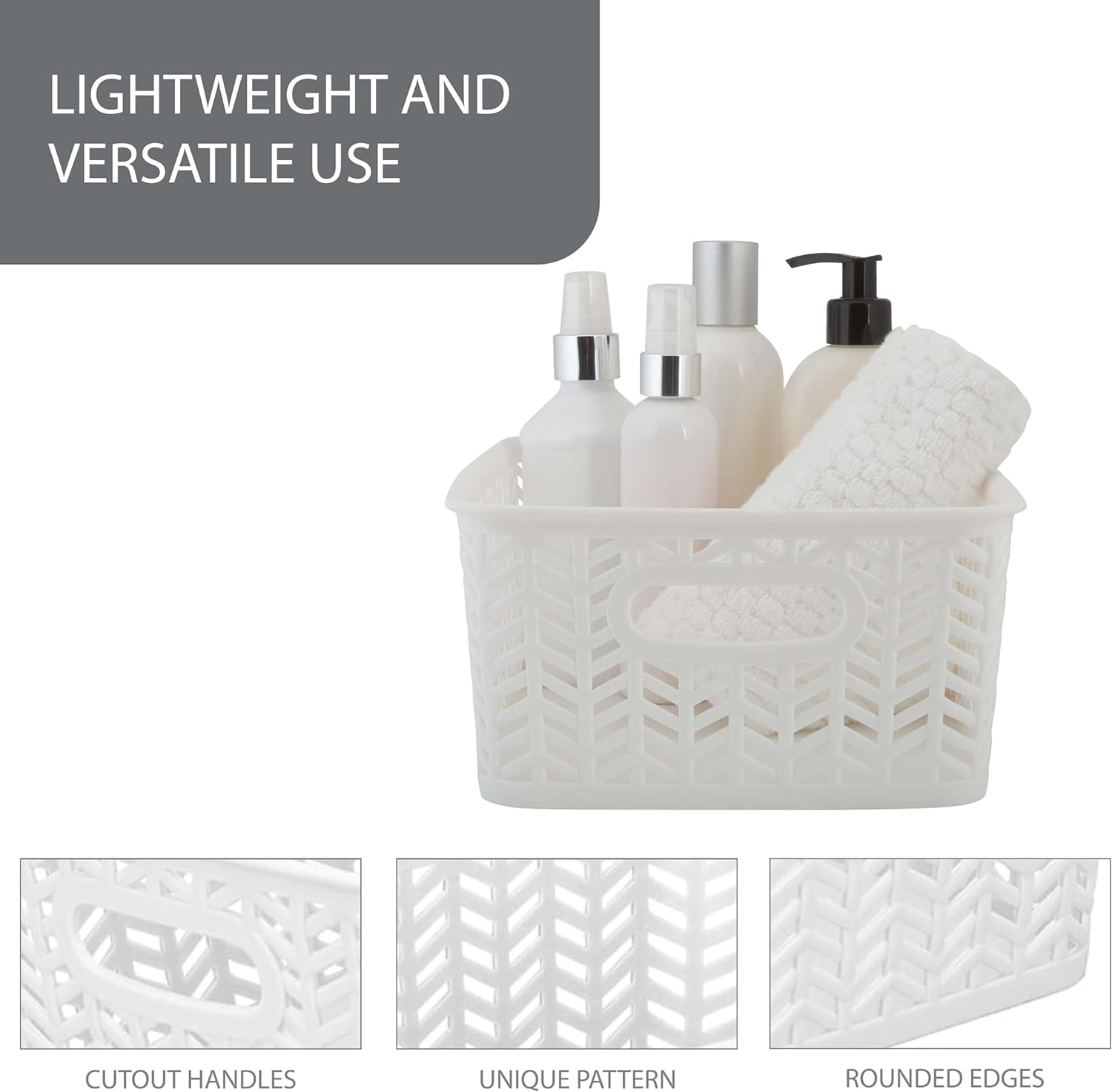 STURDY QUALITY DESIGN: Our Storage Tote Basket are made of high-quality polypropylene plastic with attractive herringbone style craftmanship that adds a warming touch to home décor. The open bin design allows easy view and access to your held items. CONVENIENT & MULTIFUNCTIONAL: The baskets are versatile for home and office organization. Organize office supplies, arts and crafts, playroom, laundry room, sewing room and more. 2 Open Handles: These baskets have two durable handles that are lightweight and easy to move to any room in the house. Dimensions: 10"x8"x4" Simplify's Herringbone Storage Bin has a unique wicker design and is made of sturdy polypropylene plastic. 2 sturdy open handles makes it easy to carry Bin around from one place to another. It has a lightweight design and holds a multitude of items, organizing and de-cluttering homes. Wide selection of colors to fit any setting.