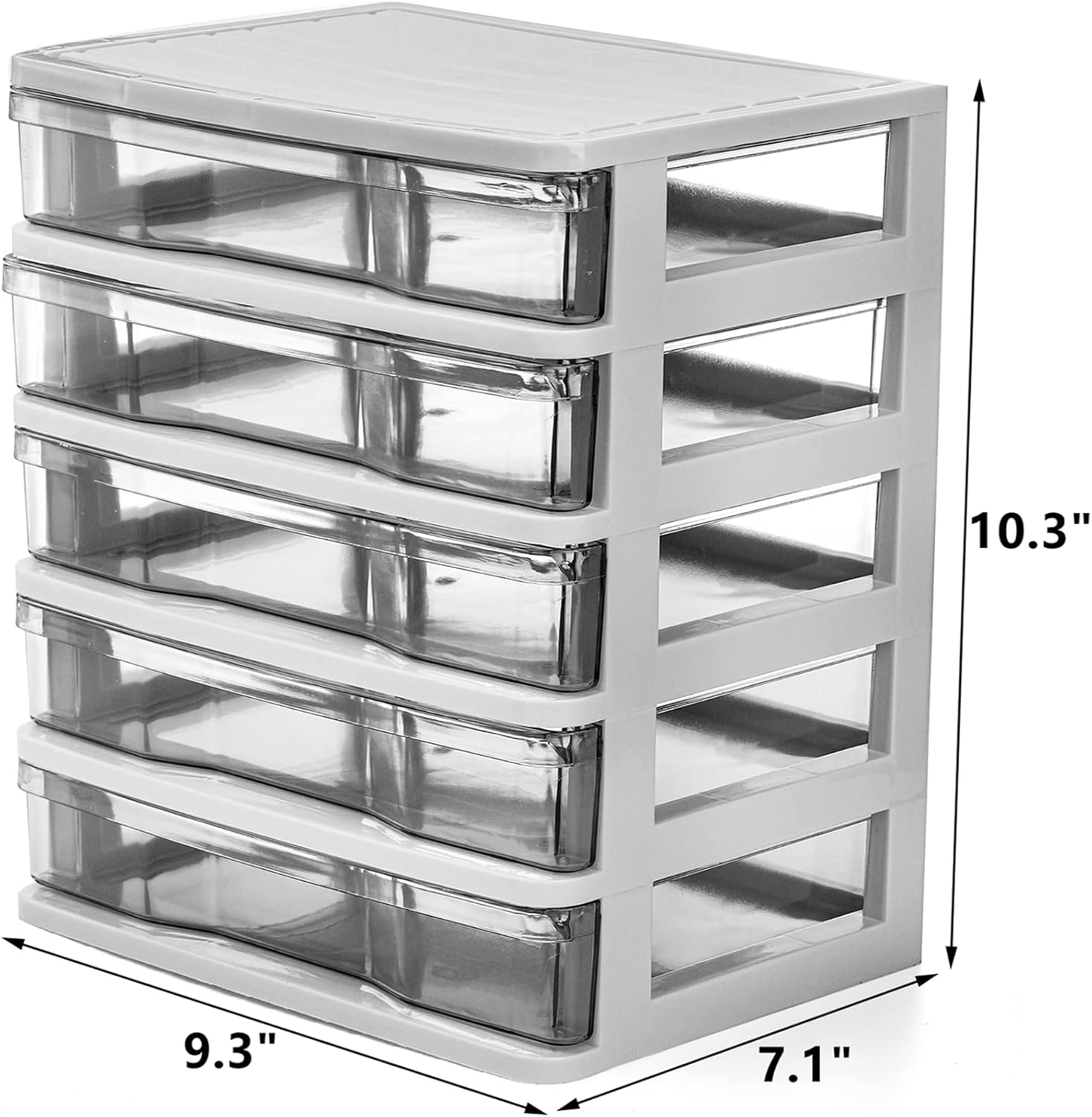 DEAYOU 5 drawer desktop storage bin unit is perfect for storing and organizing a wide range of personal arts, crafts, accessories, papers, documents, vinyl, scissors, pens, stationery and other equipment, making the most of a cluttered space Our clear desktop storage bin with 5 drawers is made of high-quality strong polypropylene plastic, non-toxic and odorless, durable and stain resistant, resilient and well-balanced, safe to use and easy to clean This plastic 5 drawer organizer measures approx. 9.3" L x 7.1" W x 10.3" H, ideal size to store office supplies, cosmetics, jewelries, sewing supplies, hair supplies, nails, screws, bolts and other small items. The simple contemporary design in classic white color also makes it a nice gift to your families and friends Our small storage container features with white frame and clear drawers, allows you to not only keep your items orderly, but find the things you need easily and quickly. The smooth integrated pulling handles offer easy using. And the buckles can effectively prevent drawers falling This mini plastic bin with drawers offers vertical storage that fits under a desktop surface or on the counter in your home or office, helps to reduce clutter and improve work efficiency. The simple modular design makes it suitable for any home decorations Product Description DEAYOU 5 Drawer Desktop Storage Bin Unit, Small Plastic Drawers Organizer White Frame with Clear Drawer, Mini Storage Bin Container Case with Drawers for Desk Our 5 drawer desktop storage bin unit is perfect for storing and organizing a wide range of personal arts, crafts, accessories, papers, documents, vinyl, scissors, pens, stationery and other equipment, making the most of a cluttered space. The simple contemporary design in classic white color also makes it a nice gift to your families and friends Compact Size and Clean View Our plastic 5 drawer organizer has ideal size to store office supplies, cosmetics, jewelries, bolts and other small items. The simple contemporary design also makes it a nice gift to your families and friends. It features with white frame and clear drawers, allows you to not only keep your items orderly, but find the things you need easily and quickly Sturdy Plastic and and Thoughtful Design This clear desktop storage bin with 5 drawers is made of high-quality strong polypropylene plastic, non-toxic and odorless, durable and stain resistant, resilient and well-balanced, safe to use and easy to clean. The smooth integrated pulling handles offer easy using. And the buckles can effectively prevent drawers falling Versatile and Space-Saving Our 5 drawer desktop storage bin unit is perfect for storing and organizing a wide range of personal arts, crafts, accessories, vinyl, scissors, stationery and other equipment, making the most of a cluttered space. It offers vertical storage that fits under a desktop surface or on the counter in your home or office, helps to reduce clutter and improve work efficiency