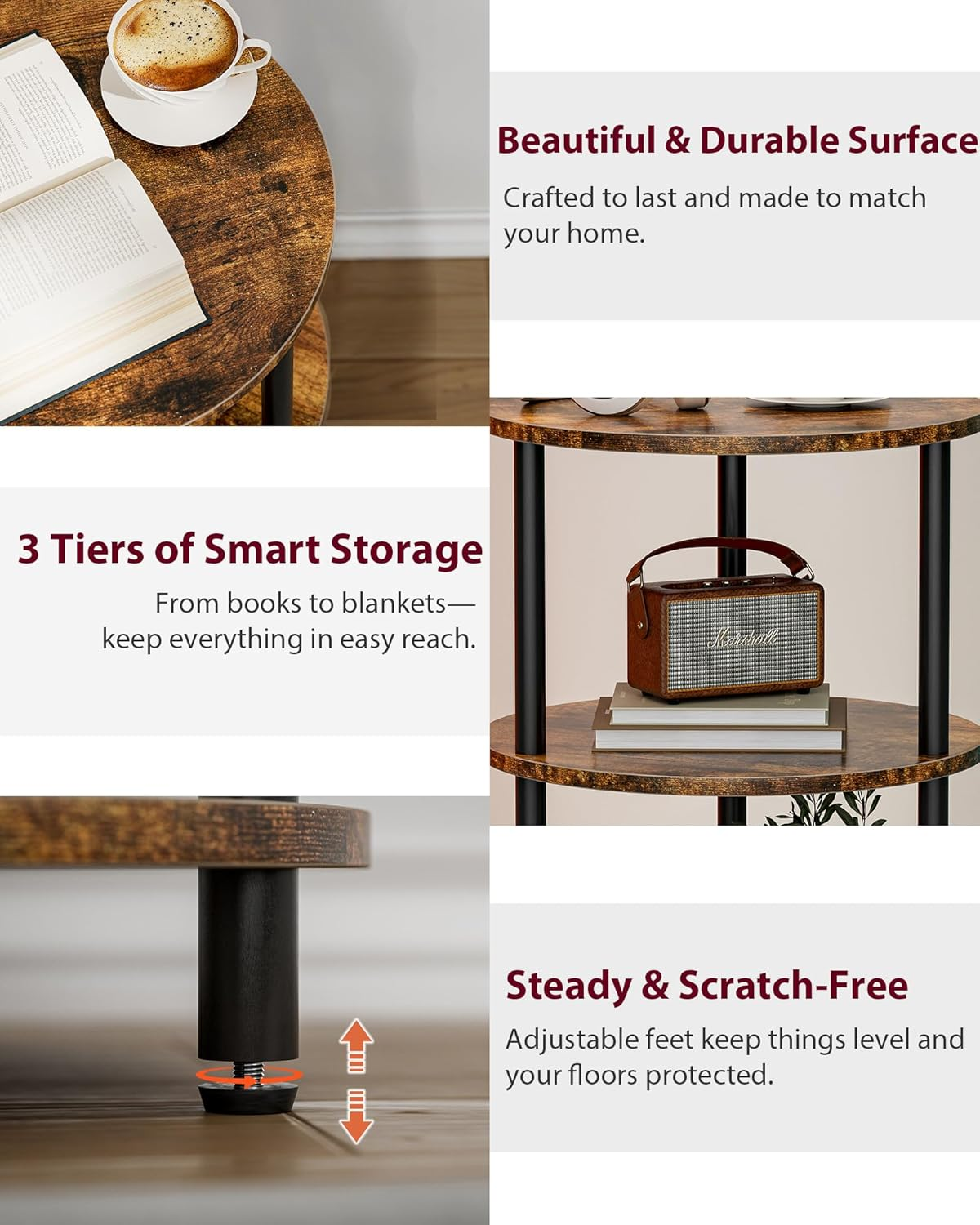 Store New Arrivals Add to Favorite View Feedback Contact Small round End Table - 3 Tier Design Accent Table, Narrow Side or Bedside Stand, Industrial Vintage Nightstand for Bedroom, Living Room, or Small Spaces, Rustic Brown Description Style No Power Outlets Color Rustic Brown Maximum Weight Recommendation 44 Pounds Item Weight 4.1 Pounds Frame Material Metal Product Dimensions 13.2"D x 13.2"W x 22.8"H Size 1 Pack ππ¦π§π¬πππ¦π & π¦πππ π₯π’π¨π‘πππ πππ¦πππ‘ β Prioritizing safety and style, this small round end table features smooth, rounded edges to prevent injuries, particularly in homes with children or elderly family members. Its contemporary aesthetic complements any living space while offering peace of mind. ππ£ππ₯ππππ§ ππ’π₯ π¦π πππ π¦π£ππππ¦ β Measuring 13.2"D x 13.2"W x 22.8"H, this small side table for small spaces is ideal for compact areas. With 3 spacious tiers, it provides a perfect spot for organizing books, magazines, or decorative items, delivering maximum storage in a minimal footprint. ππ¦π§π¨π₯ππ¬ & ππ¨π₯ππππ ππ¨πππ β Supported by stable steel legs with reinforced round tubing, this couch end table holds up to 44 lbs per shelf. Adjustable rubber feet protect floors from scratches and keep the table balanced, even on uneven surfaces. ππ©ππ₯π¦ππ§πππ ππ¨π‘ππ§ππ’π‘ππππ§π¬ β This bedroom end table can serve multiple purposes, including as a living room accent table, nightstand, couch side table, or even a vintage side table for displaying plants or decor. Its compact size makes it a seamless fit in any space. ππ€π¨πππ & πππ¦π¬ ππ¦π¦ππ πππ¬ β Forget the hassle of complicated furniture setups! With simple instructions and minimal parts, this round coffee table is ready to use in no time, saving you hours of assembly effort. Product description Thoughtfully designed to simplify your space β and elevate it. From Living Room Essential to Stylish Organizer β Perfect for Any Corner of Your Home. Home-ready in every sense β easy, elegant, and right where you need it. A Little Table That Works Everywhere From poolside coffee to couch-side storage I tried it in every cornerβit always looked good and held everything. The video showcases the product in use. The video guides you through product setup. The video compares multiple products. The video shows the product being unpacked. A Little Table That Works Everywhere Merchant Video Perfect Size. Perfect Fit. 3 tiers, more storage, zero clutter. Lightweight, easy to move, beautiful wood that fits any room. The video showcases the product in use. The video guides you through product setup. The video compares multiple products. The video shows the product being unpacked. Perfect Size. Perfect Fit. Merchant Video The Table Everyone Finishes in Minutes No tools, clear instructions, just twist and done. Show off dΓ©cor on three shelves, keep it steady with anti-slip feet. The video showcases the product in use. The video guides you through product setup. The video compares multiple products. The video shows the product being unpacked. No tools, clear instructions, just twist and done. Merchant Video The Little Table That Follows Your Day Morning coffee, evening readingβit fits every moment Move it with ease, style it your way, enjoy its calm sturdiness. The video showcases the product in use. The video guides you through product setup. The video compares multiple products. The video shows the product being unpacked. A Small Table That Works Big Merchant Video I Love How Easy It Is to Carry and Use It took me 5β10 minutes to put together. Now it works in my living room, office, even outside. The video showcases the product in use. The video guides you through product setup. The video compares multiple products. The video shows the product being unpacked. I Love How Easy It Is to Carry and Use Merchant Video βI Put It Next to My Couchβ¦ Now I Love It.β Candles, books, plantsβit all just works. Took less than 10 minutes to assemble, and now itβs my favorite corner. The video showcases the product in use. The video guides you through product setup. The video compares multiple products. The video shows the product being unpacked. Candles, books, plantsβit all just works. Merchant Video Smartly Built with Safety, Strength, and Stability in Mind. This isnβt just a table β itβs thoughtfully crafted for real life. From materials to mechanics, every detail is built for better living. Designed to Complement Your Bedroom with Style and Everyday Function. Create a bedroom that feels calm, collected, and truly yours β one thoughtful detail at a time. The compact size makes these side tables ideal for small spaces, whether placed next to a bed, sofa, or in a cozy reading nook. Balanced Beauty for Every Corner of Your Home Simplify your space, elevate your style β one small table, endless possibilities. What are the exact dimensions of the table? The table measures 22.8" tall and 13.2" in diameter, with about 9.8" between each shelf β compact enough for small spaces but spacious enough for everyday use. What materials is the table made from? Itβs built with engineered wood shelves and a sturdy steel frame β waterproof, scratch-resistant, and wobble-free. Where can I use this table? Itβs perfect as a side table in the living room, a nightstand in the bedroom, or a plant stand in hallways or corners. What if I receive a damaged or missing part? We're here to help! Just reach out through the support channel, and weβll resolve any issue quickly and hassle-free. Is it easy to assemble? Absolutely. All tools and instructions are included. Assembly usually takes less than 15 minutes. ABOUT US We offer the best prices around on high quality products. Our E-store includes media such as books, movies, music and games while offering electronics, toys, sporting apparel, clothi