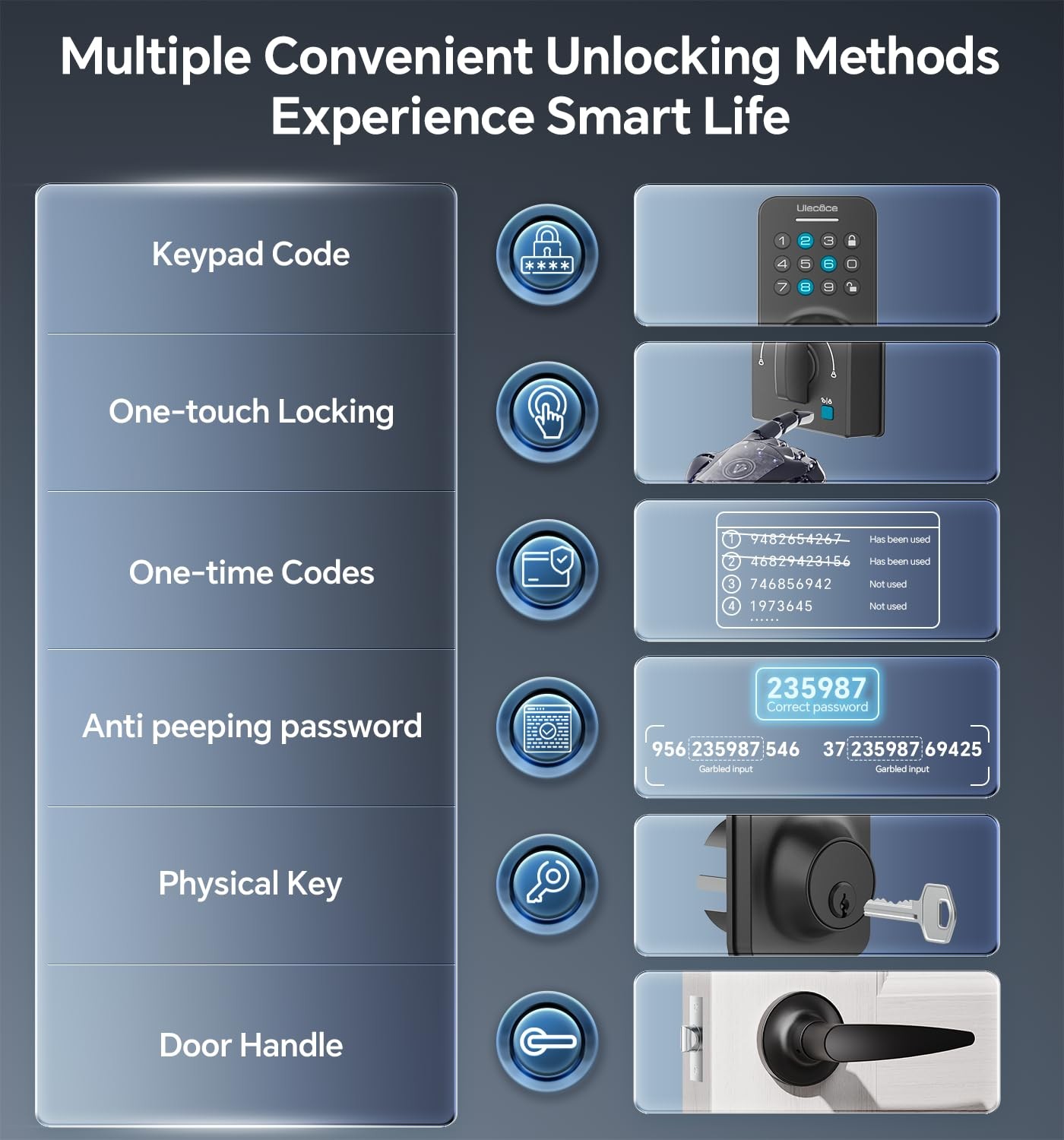 Keyless Entry Door Lock Deadbolt with Handle Set, Keypad Door Lock with Handle Smart Door Locks for Front Door with Set Code Door Lock with Easy Installation, Auto Lock, Matte Black Keyless Entry Deadbolt with Handle Set: smart keyless entry door lock supports multiple ways to access, 100 user codes (97 users and 3 admin passcodes), one- time code, 2 backup keys. Everything you need in 1 safe and secure smart lock. Smart Access Management: Front door lock set keyless entry with handle are 3 administrators and 97 user codes. Generate and share one-time, permanent and scheduled codes with your family,house sitters, guests. Perfect for homes, Airbnb, apartments, offices, and hotel. Auto-Lock Convenience: Digital door locks for front door is designed with a smart one-touch switch. Keypad door lock offers one-touch lock feature to control the door easily. You can enable the auto-lock feature and set the timer from 10s-30s! Besides, there is a “one-touch lock” function on the rear lock body, making it convenient for you to lock and unlock in a timely manner. Now you don't need to worry about forgetting to lock the door. Safeguard Home Security: Keypad door lock with handle equipped with auto-lock, one-touch locking, anti-peeping code, low battery alert to enhance your home security. Additionally, the lock is powered with 4 AA batteries (not included) could be used for around 180 days without frequent battery . Our door lock is built to withstand extreme temperatures (-4℉ to 140℉) and is IP54 waterproof. It's an essential tool for your home. Easy to Install: The door locks for front door no extra drilling and costly locksmith required, just use a screwdriver to easily install and program the door lock in 15 minutes. It is compatible with left and right-hand doors.